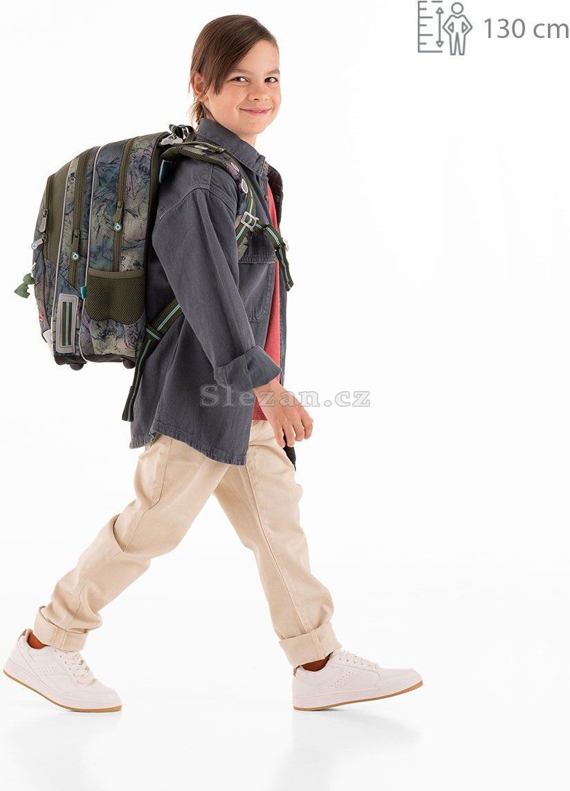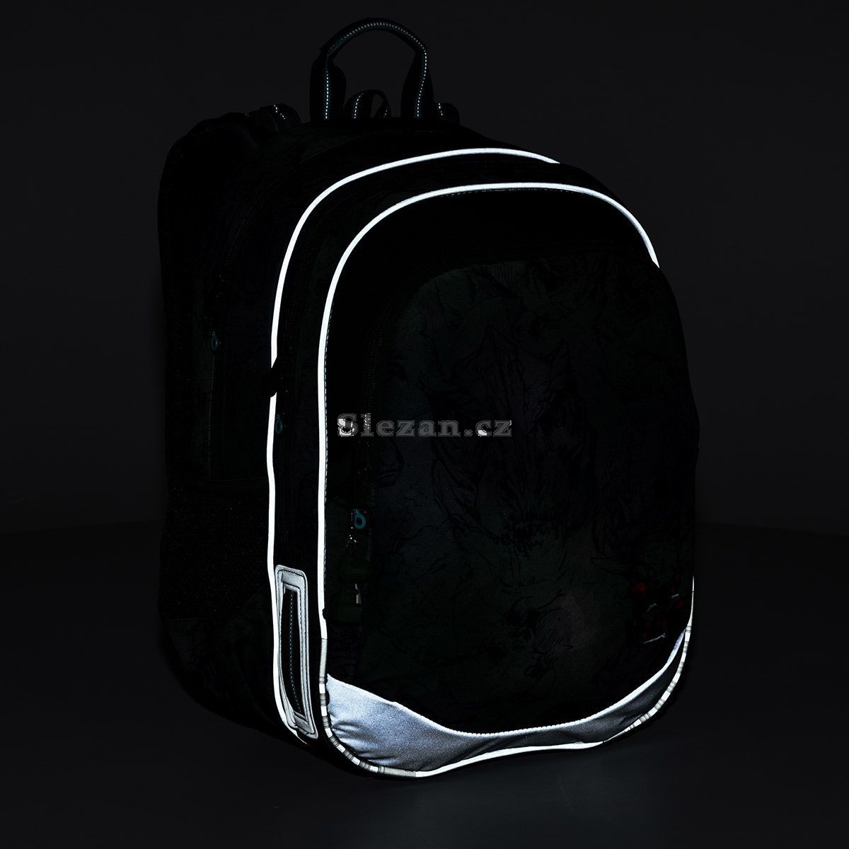 Záda batohu jsou tvořena z lehké tvarované pěny. Díky ergonomicky tvarovaným polstrovaným popruhům bude batoh pohodlně nosit i těžký náklad. Popruhy na záda školáčkovi nejdříve utáhněte ve spodní části na délku tak, aby batoh seděl na kosti křížové. Poté v horní části utáhněte popruhy směrem k zádům, aby od zad s těžkým nákladem neodstával. Dlouhé konce popruhů můžete díky magnetům připnout k tělu popruhu, aby nevlály kolem těla.