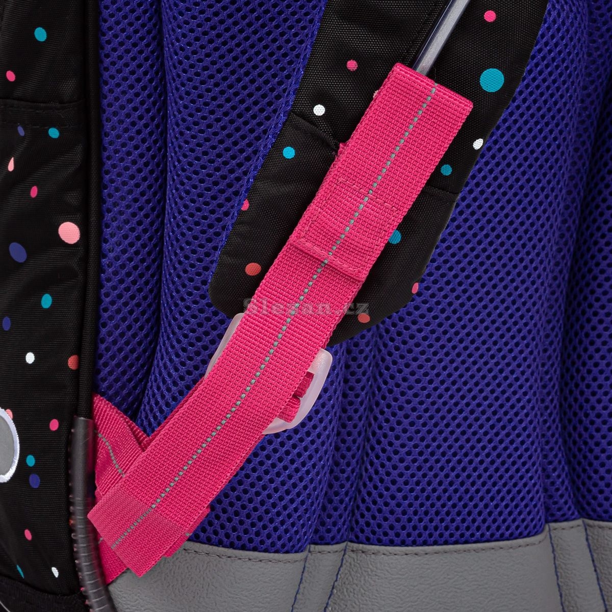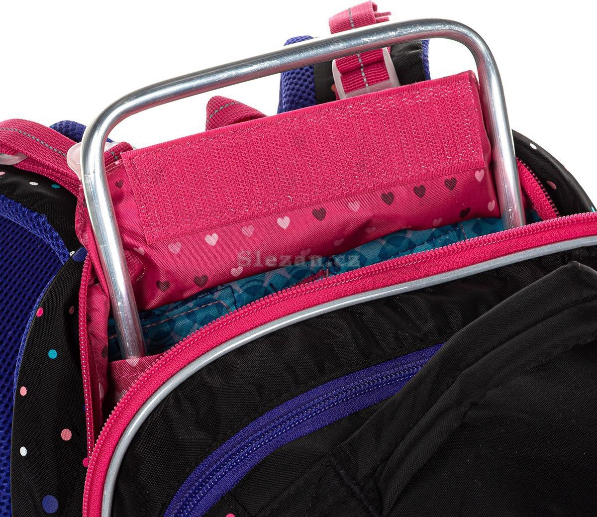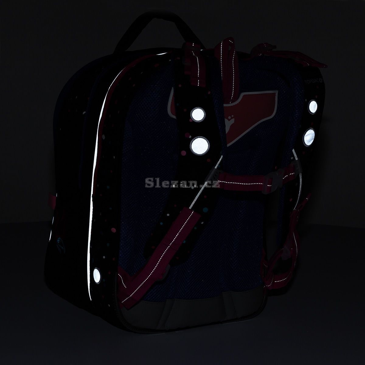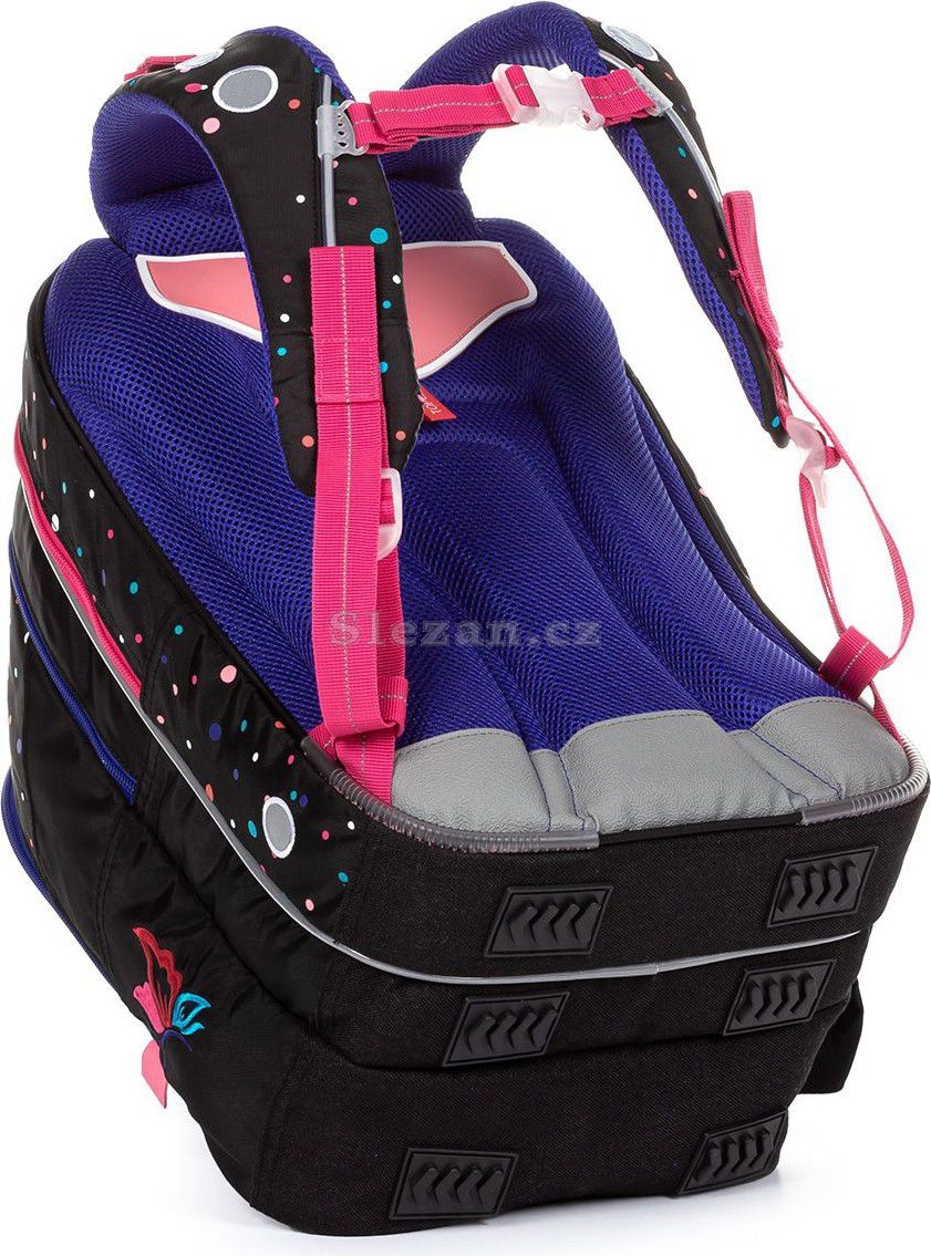 Oblíbený objemný tříkomorový střih batohu pro první stupeň ZŠ jsme letos oblékli do střídmých praktických barev s vyšitými motýlky na přední kapse a barevnými puntíky. Navíc je doplněn chlupatým přívěskem. Batoh díky svému objemu vydrží po celý první stupeň ZŠ! velikostně ideální do 1. – 5. třídy ZŠ pevná anatomicky tvarovaná záda a hrudní popruh tři komory a hluboká přední kapsa vhodný od první třídy Střih COCO je zřejmě našim nejoblíbenějším pro první stupeň ZŠ. Tři objemné komory pojmou úplně všechno učivo od první třídy klidně až do páté. O praktický černý batoh si psaly hlavně maminky. Malé školačky ale určitě ocení barevné vyšívané motýlky, chlupatý přívěsek, puntíky i barevné zipy. Všechny tyto prvky tmavý batoh oživují. Záda batohu jsou vyvedena v modré barvě. Jsou pevná, anatomicky tvarovaná a polstrovaná s lehounkou hliníkovou výztuhou. Na záda i drobnějších dívek batoh správně nasadíte díky ramenním popruhům, které lze utáhnout v jejich horní i spodní části. Díky dopnutí hrudního pásu batoh ze zad padat určitě nebude ani v zimě, kdy občas popruhy batohů kloužou po bundách. V koncích popruhů jsou všity magnetky, díky kterým je můžete připnout k tělu ramenního popruhu tak, aby nevisely kolem těla. Zadní a prostřední komory jsou užší - ideální pro ukládání desek na sešity, cvičebnic, nebo těch nejtěžších učebnic. Přední komora je nejširší, nejobjemnější a navíc v ní najdete i praktickou kapsičku na zip a odnímatelnou karabinku na klíče, díky které je nebudete muset v batohu hledat. Přední hluboká kapsa je ideální na všechny další drobnosti. Můžete do ní umístit třeba i krabičku se svačinkou, nebo penál ve stejném designu PENN 20004. Uvnitř kapsy je jmenovka. Na boku batohu je pak kapsička na lahvičku na pití. Radíme do lahvičky dát jen sirup, vodu si děti mohou dopustit ve škole. Reflexní prvky najdete všude na tomto batohu - jsou na čele, v paspulích batohu, boku batohu i na ramenních popruzích. Vše připraveno? Tak šup, rychle do školy! Další vychytávky: měkké ucho na přenášení batohu v ruce ouško na zavěšení batohu na lavici zátěr proti dešti p evný nepropustný materiál TOPDURA na dnu batohu batoh byl úspěšně otestován v ITC Zlín Náš tip: Hliníkovou výztuhu zad nevytahujte, zádový systém by tak ztratil anatomický tvar a utrpěla by i pevnost batohu. Váha výztuhy je pouze 0,06 kg!