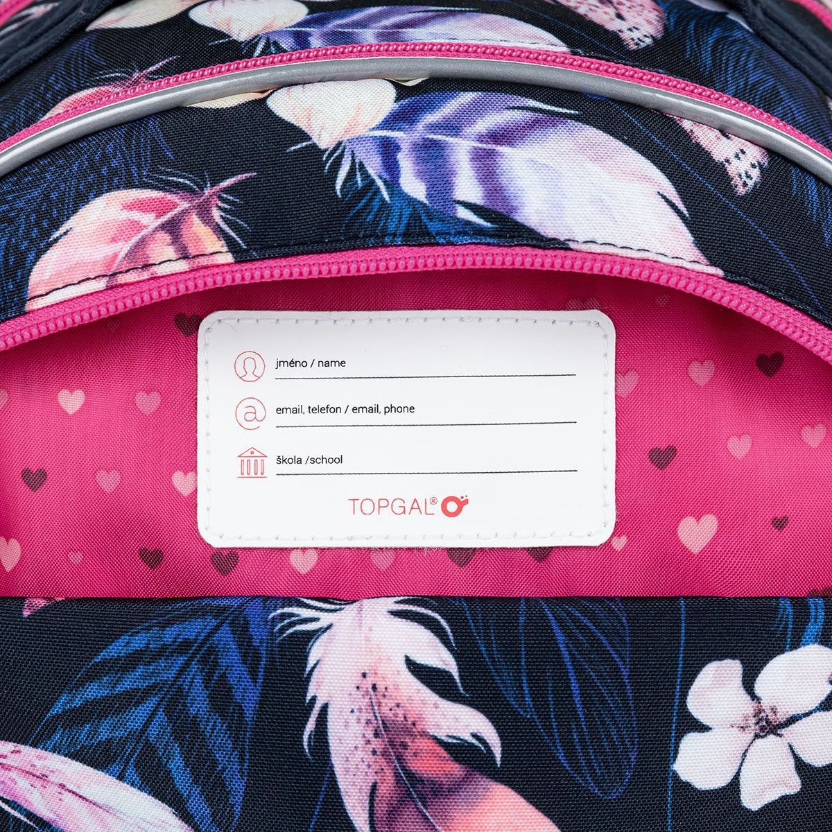 Batoh má tři objemné komory. Zadní komora je širší - doporučujeme k zádům dávat nejtěžší učebnice nebo desky na sešity. Přední komora je o něco užší a je v ní umístěna ještě malá síťová kapsa na zip a jmenovka.