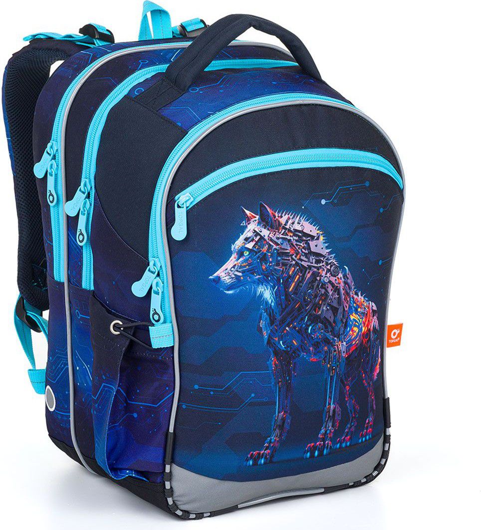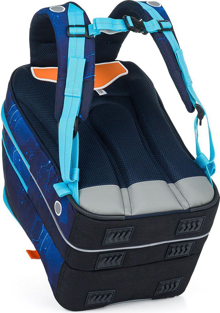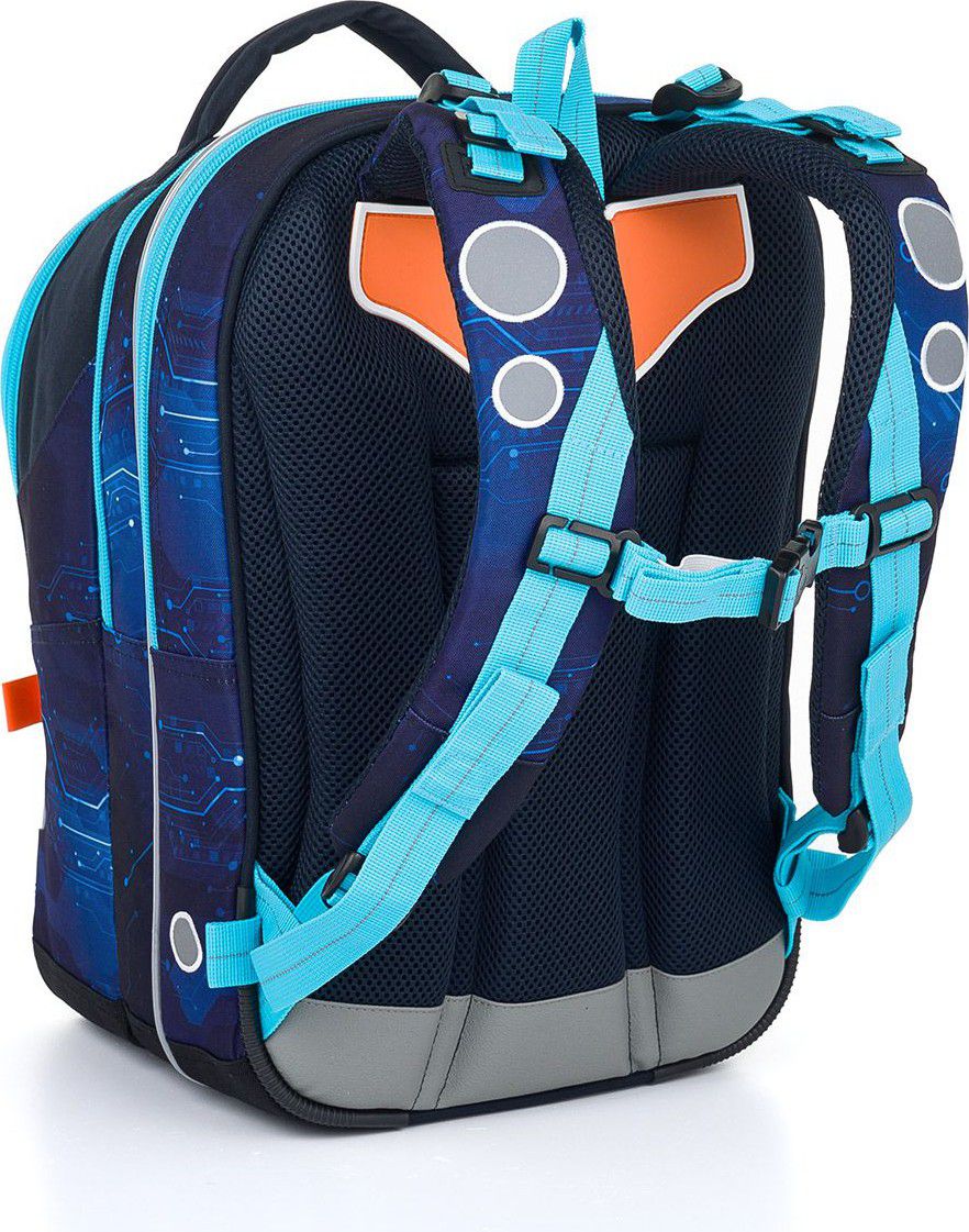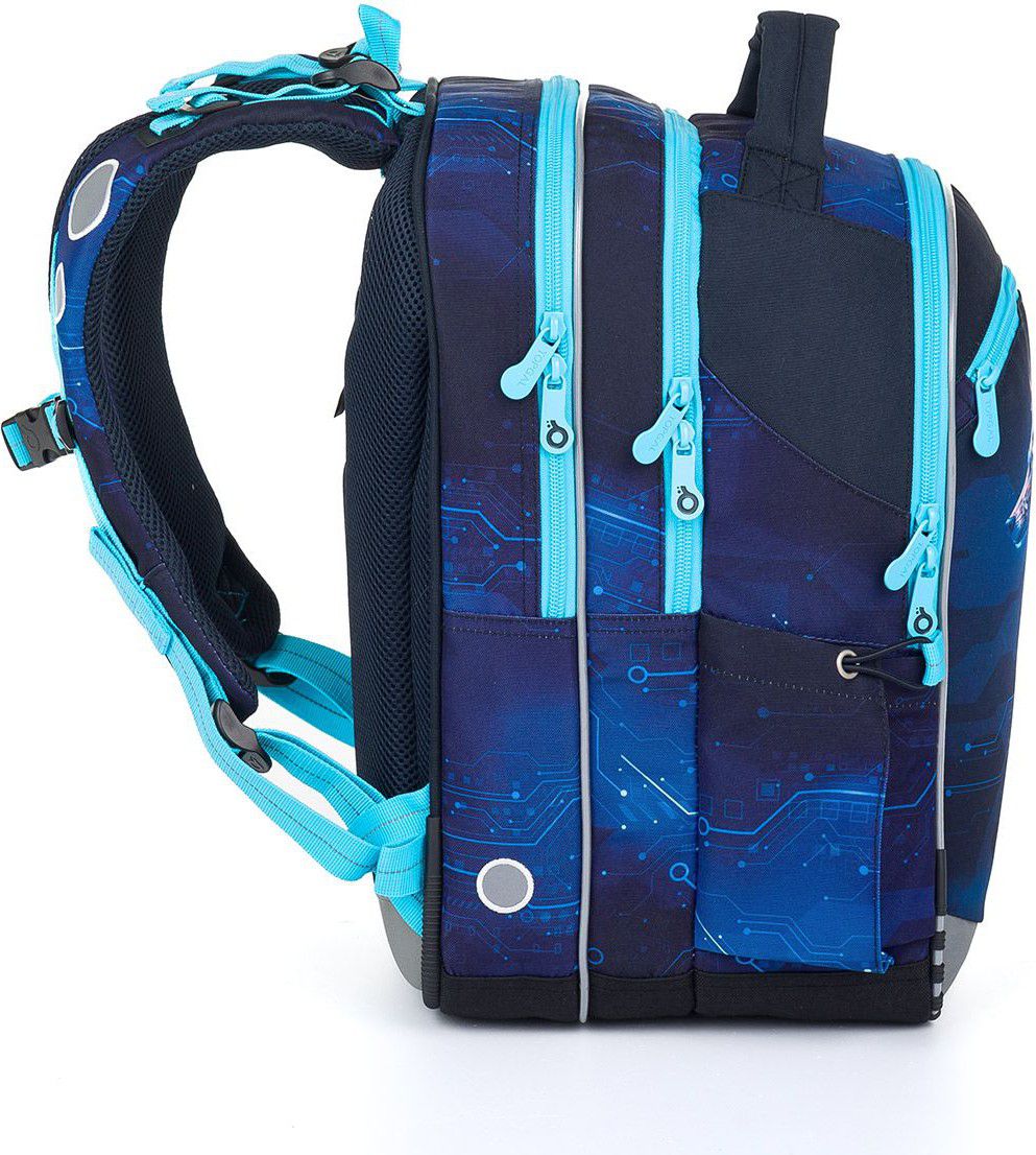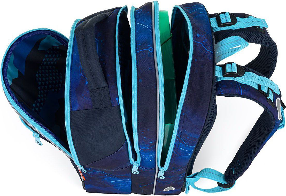 Zadní komora je nejširší, sem doporučujeme dát nejtěžší učebnice nebo desky na sešity. Přední komora je o něco užší a je v ní umístěna ještě malá síťová kapsa na zip a jmenovka.