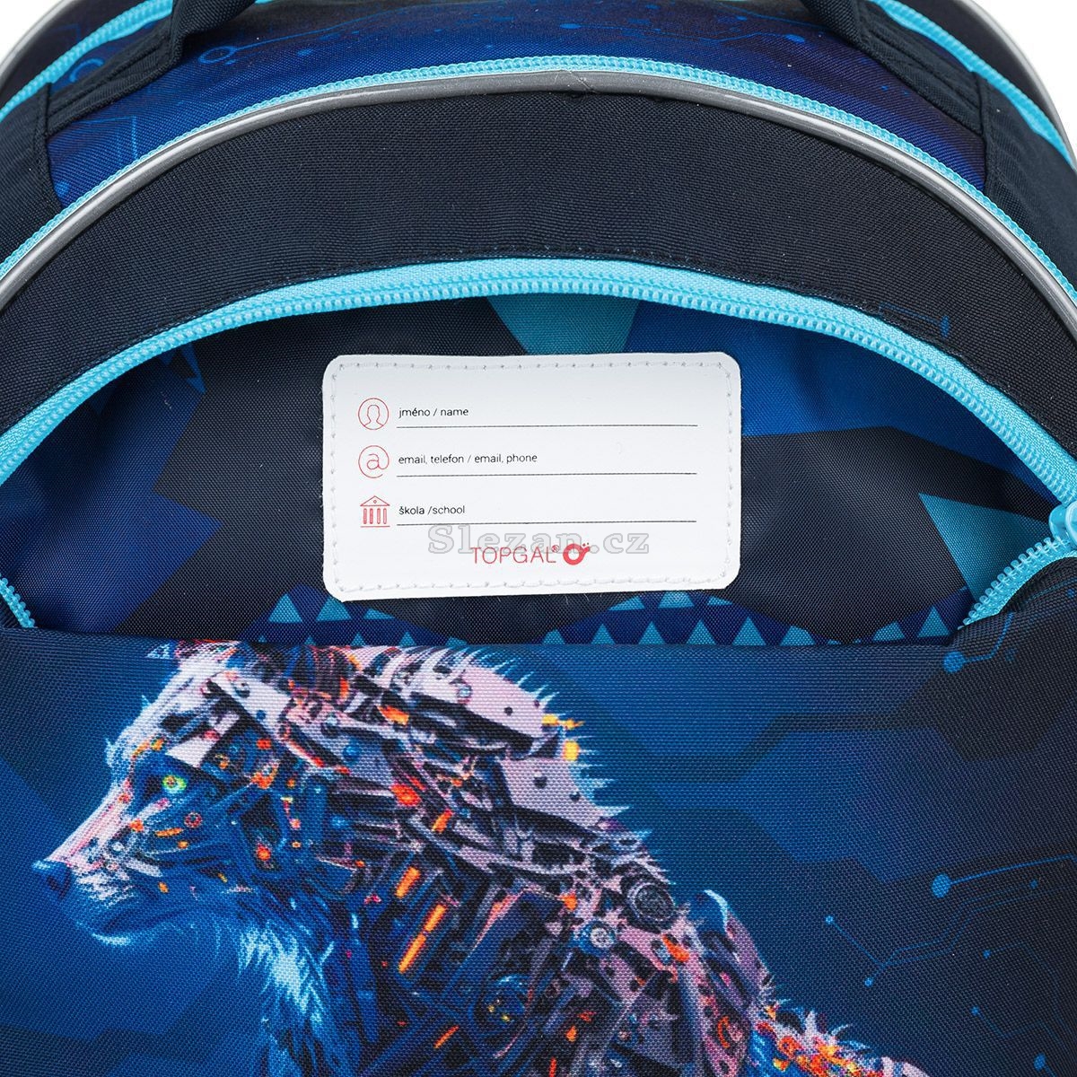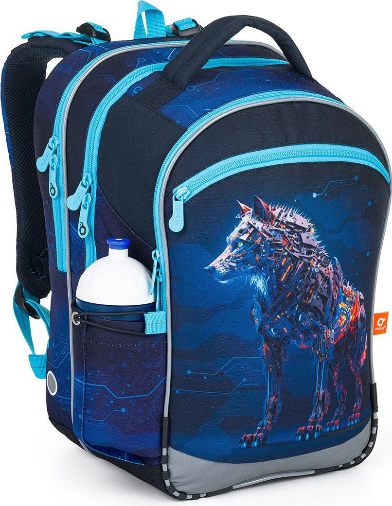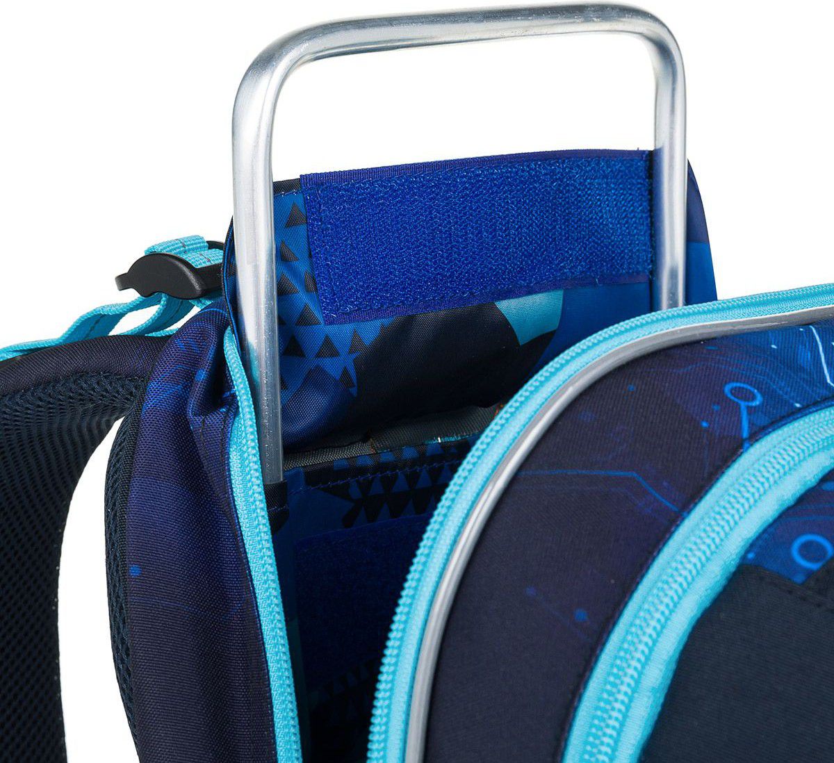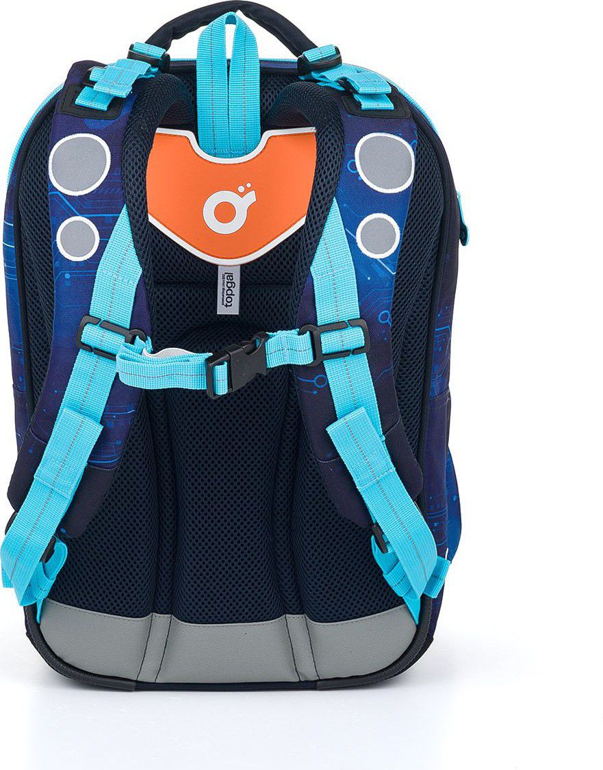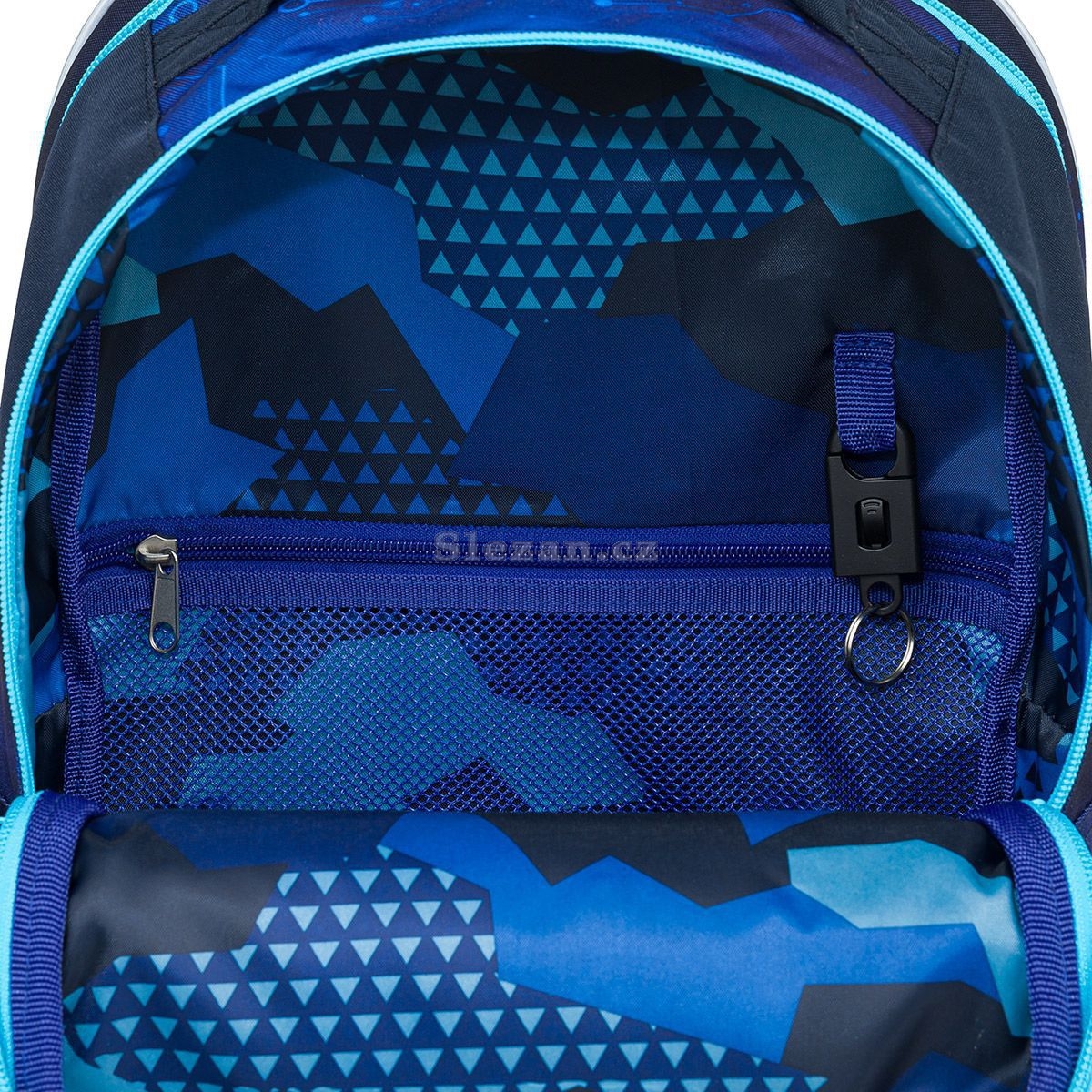 Zadní komora je nejširší, sem doporučujeme dát nejtěžší učebnice nebo desky na sešity. Přední komora je o něco užší a je v ní umístěna ještě malá síťová kapsa na zip a jmenovka.