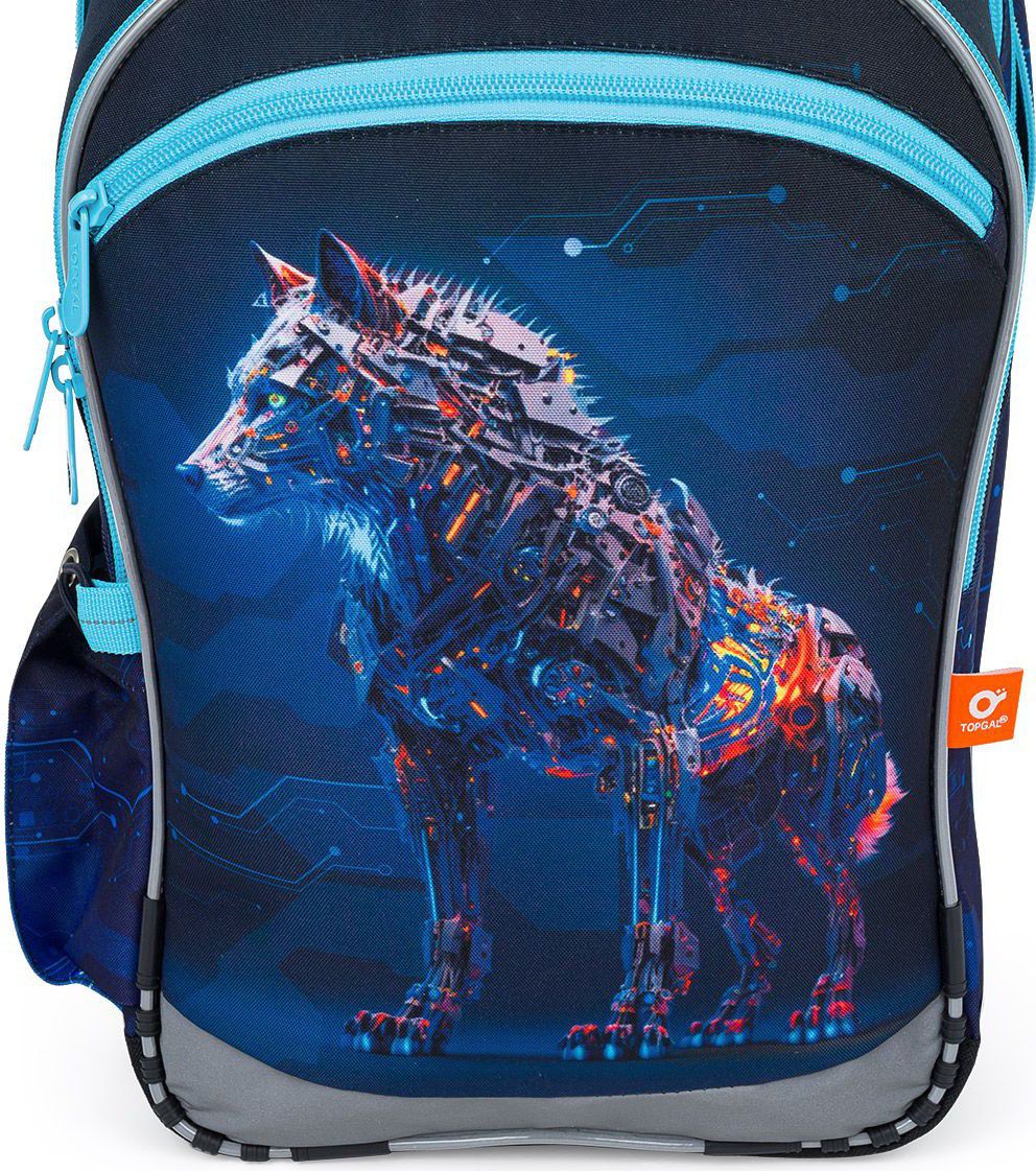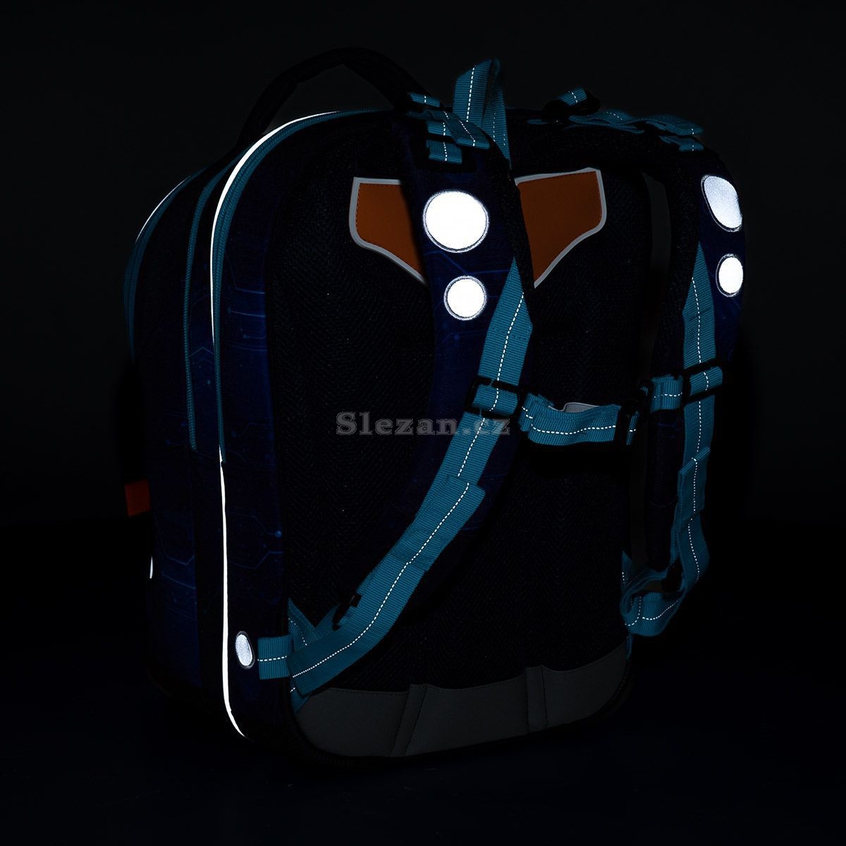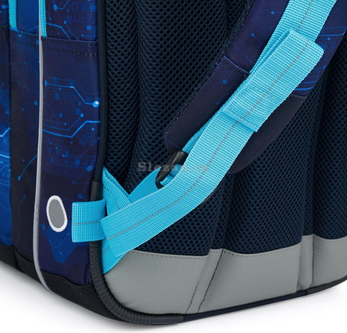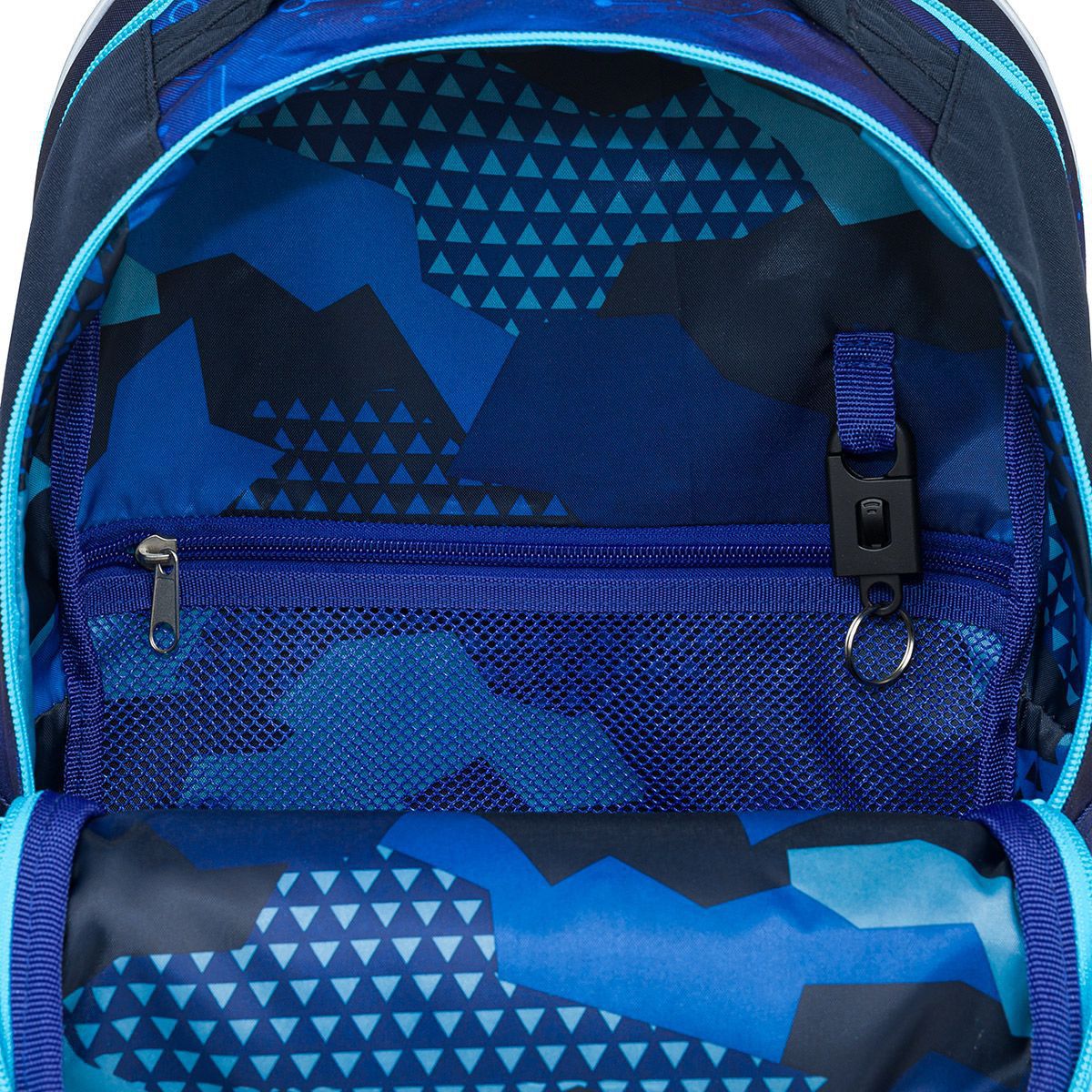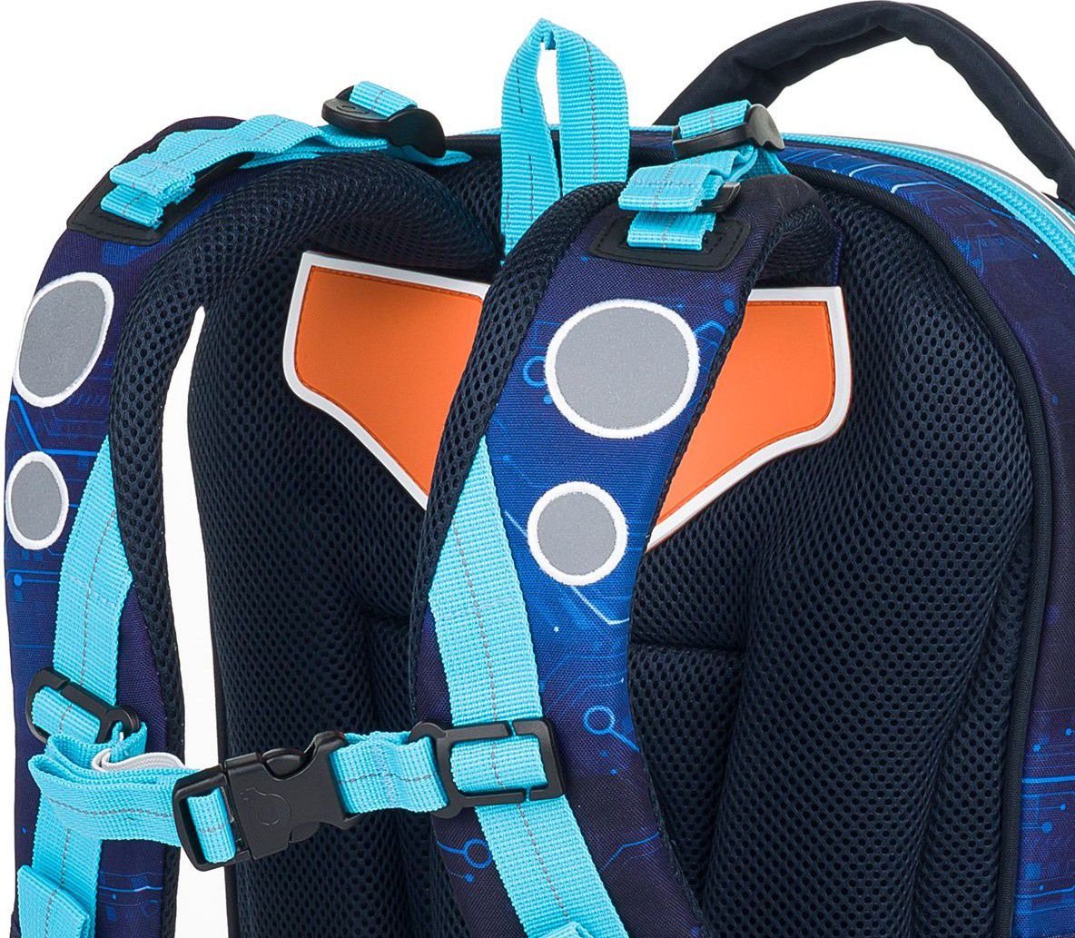 Zadní komora je nejširší, sem doporučujeme dát nejtěžší učebnice nebo desky na sešity. Přední komora je o něco užší a je v ní umístěna ještě malá síťová kapsa na zip a jmenovka.