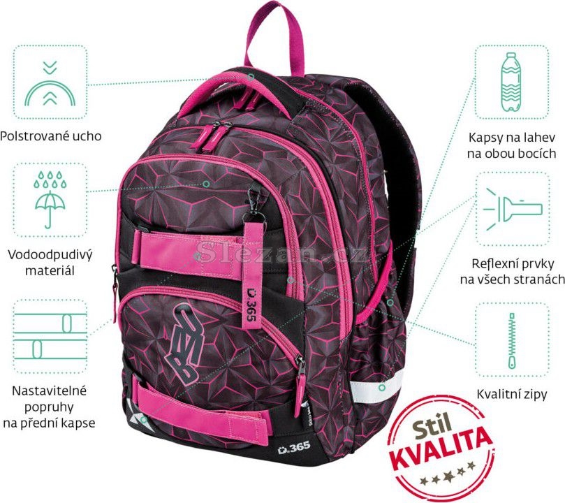 - PŘEHLEDNÉ VNITŘNÍ USPOŘÁDÁNÍ – dvě komory na formát A4 a menší přední kapsy na svačinu, penál a drobnosti