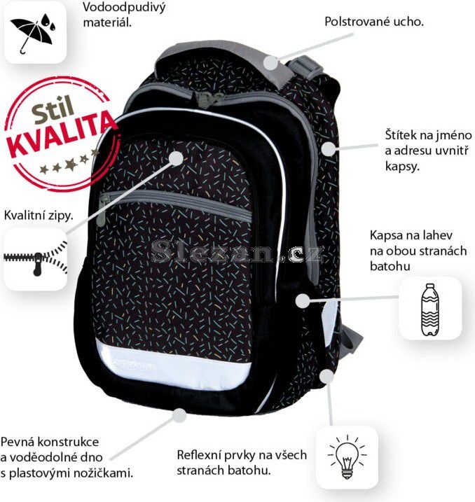 Kvalitní, ergonomicky tvarovaný odlehčený školní batoh je vybaven reflexními prvky a anatomicky tvarovanými zády s pevnou konstrukcí.