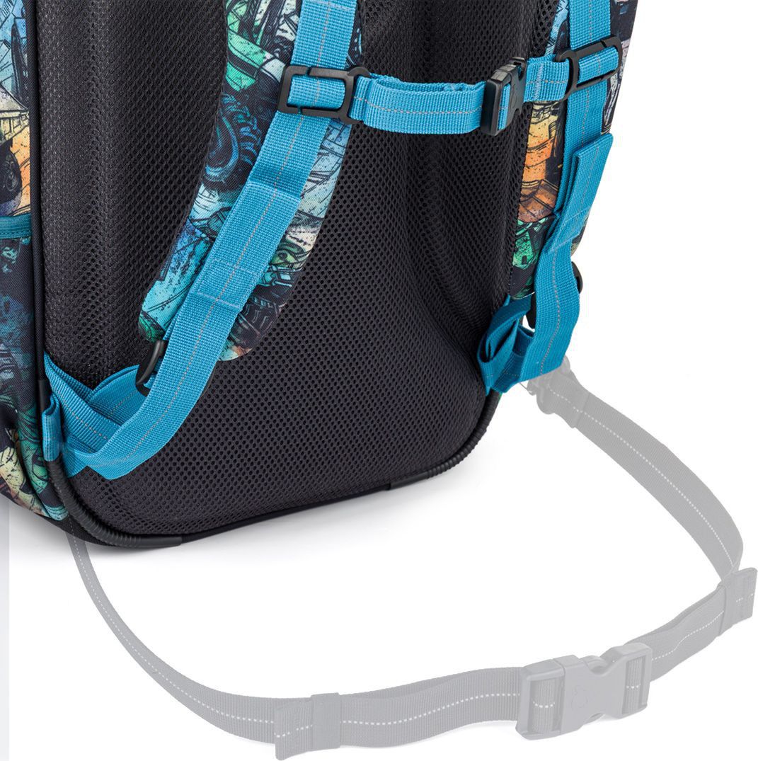 Batoh má pevná, ergonomicky tvarovaná záda a měkce polstrované ramenní popruhy, které se snadno přizpůsobí drobnější postavě dítěte. Výškově nastavitelná hrudní přezka pomáhá udržet batoh správně usazený na zádech a zvyšuje pohodlí při nošení.