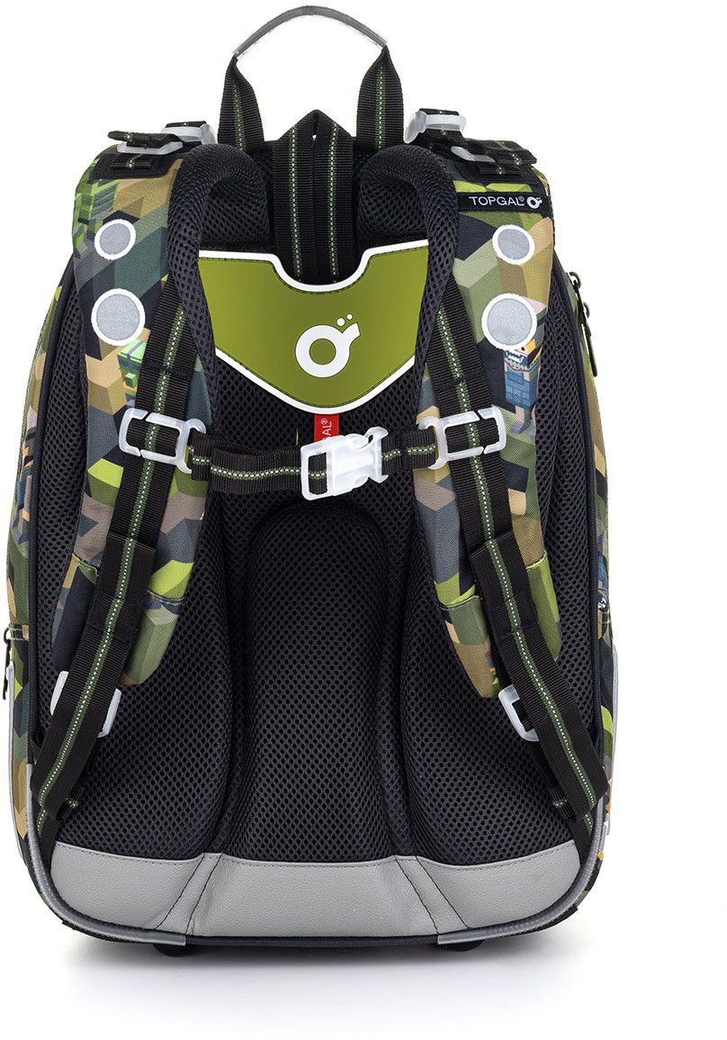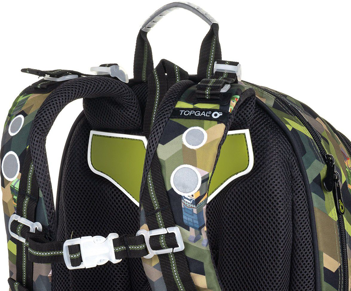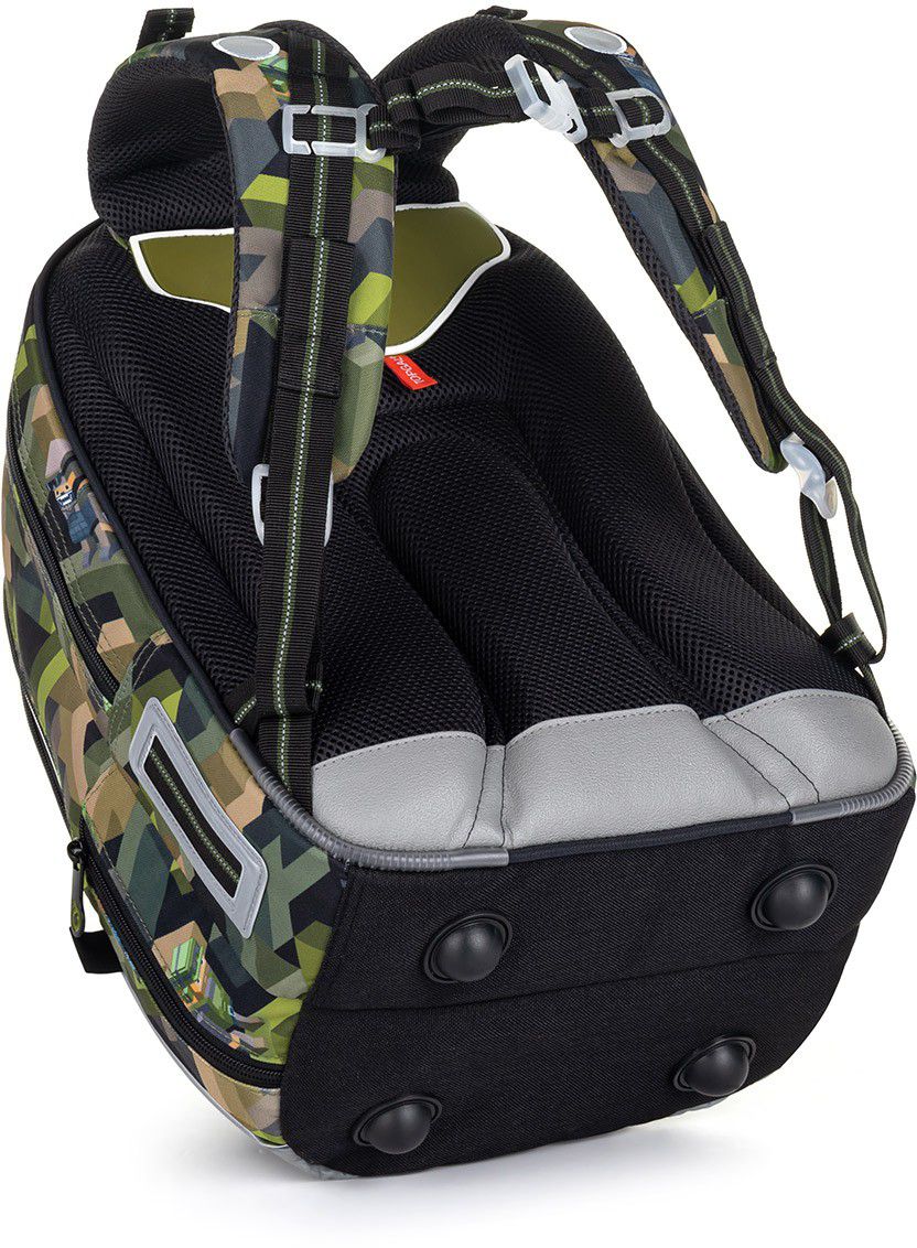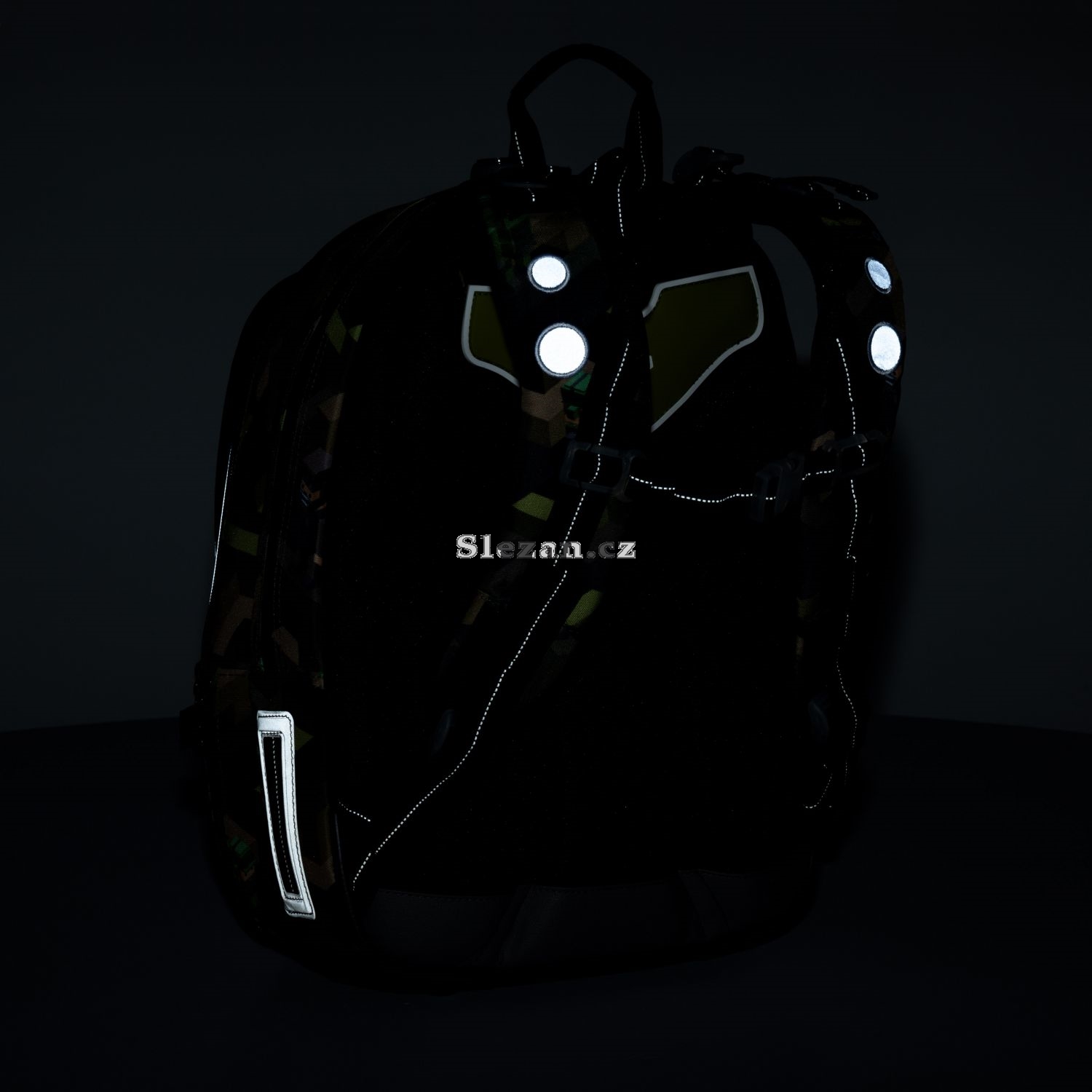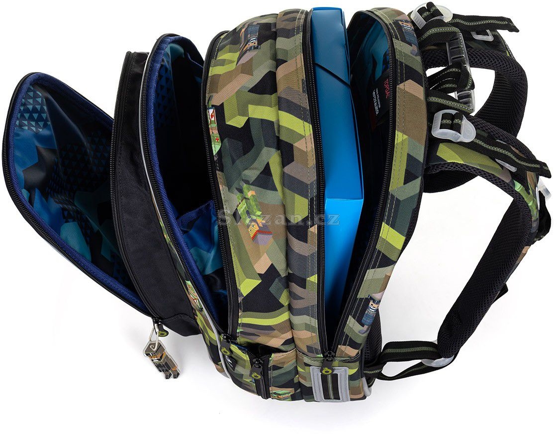 Zadní komora je užší - k zádům dávejte vždy ty nejtěžší učebnice nebo desky se sešity. Přední komora je objemnější a na dvě části ji rozděluje praktická přepážka, takže bude třídění školních potřeb uvnitř hračka. Přední hluboká kapsa je ideální na všechny další potřebnosti. Můžete do ní umístit svačinku v krabičce - třeba té naší ZOLA 18053, nebo penál PENN 20046 ve stejném designu. Navíc je v přední kapse ještě karabina na klíče a jmenovka. Záda batohu jsou pevná, vyztužená anatomicky tvarovaným polstrováním a hliníkovou výztuhou.