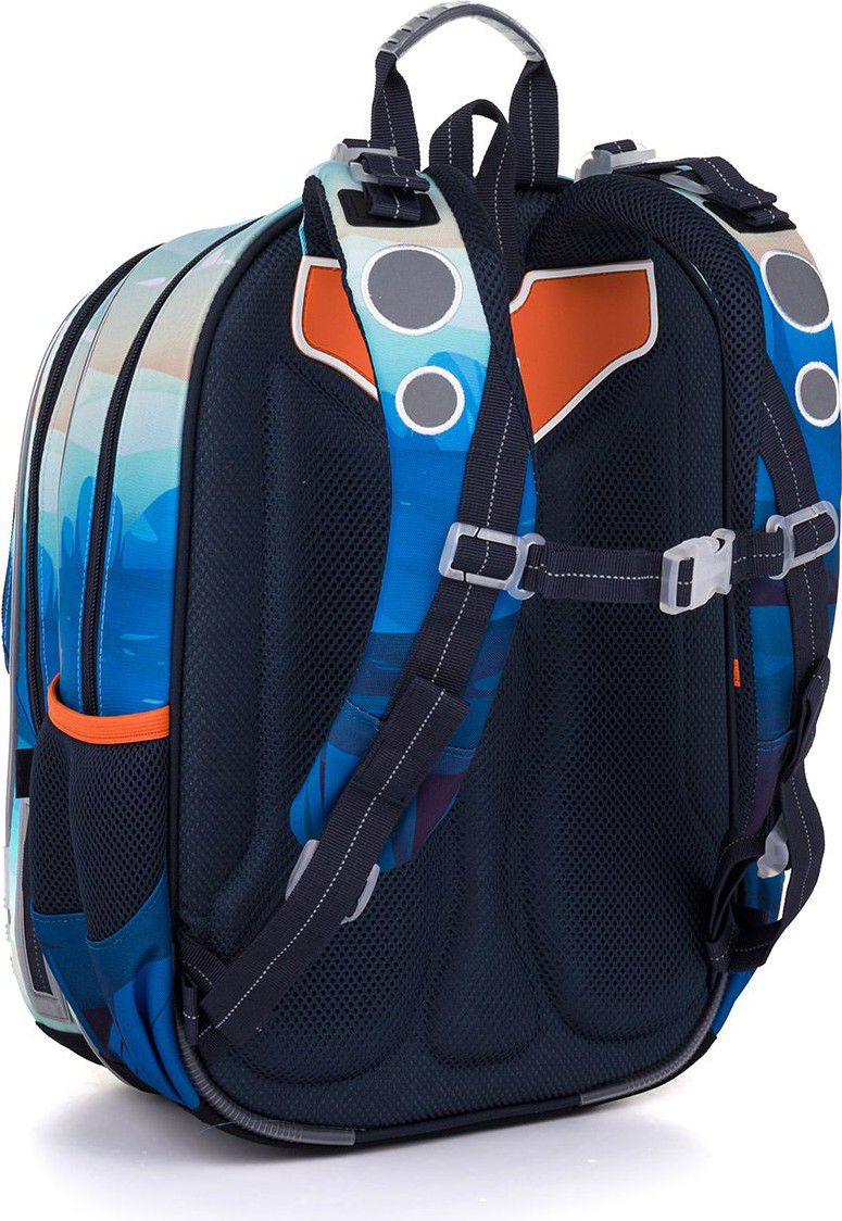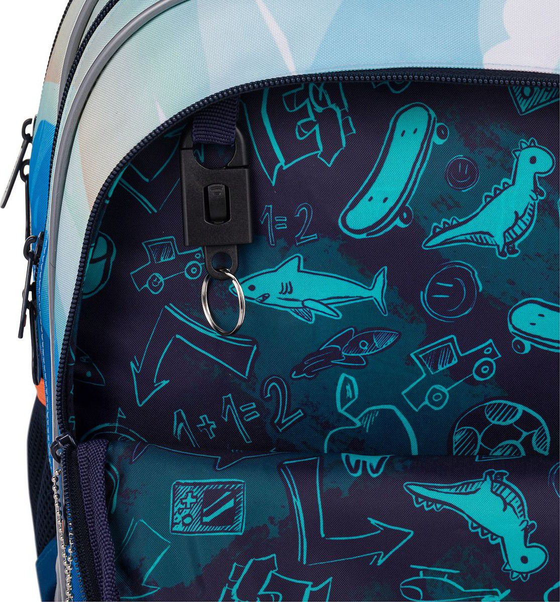 Batoh má dvě objemné hlavní komory. Zadní komora je objemnější a spolehlivě pojme všechno těžké učivo. Přední komora je o něco užší a skrývá malou síťovou kapsu na zip a jmenovku. Do přední hluboké kapsy se vejde penál PENN 25005 ve stejném designu nebo krabička na svačinku. Je v ní také karabina, díky níž odpadne složité hledání klíčů na dně batůžku. Boční kapsy jsou přizpůsobené lahvím ZIVA o objemu 0,5 litru.
