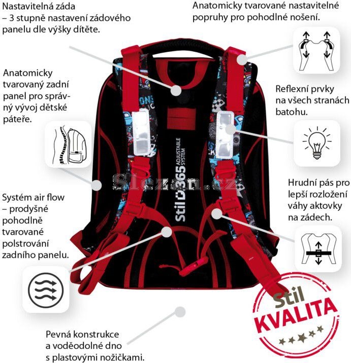 • 3D ZÁDOVÝ SYSTÉM – batoh perfektně sedí na zádech. Anatomický zádový panel se přizpůsobí páteři dítěte a systém Air Flow a prodyšné polstrování umožní cirkulaci vzduchu a příjemné nošení. Hrudní pás s kvalitní přezkou zajistí dobré usazení aktovky na zádech dítěte