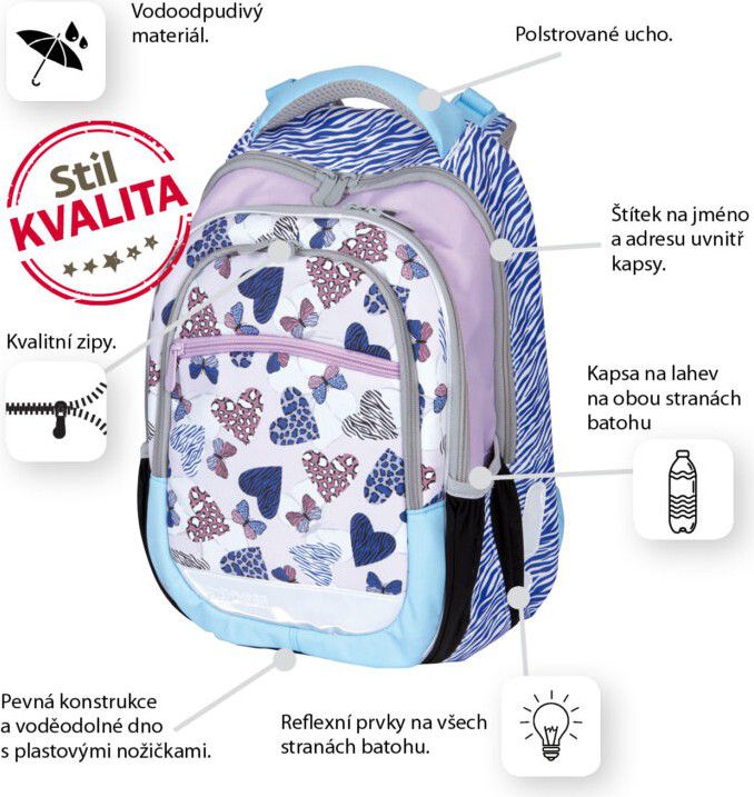 - Hrudní pás pro lepší rozložení váhy školního batohu na zádech.