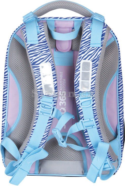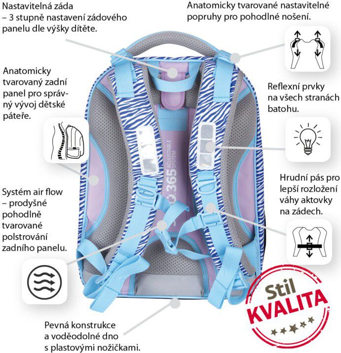 - 3D ZÁDOVÝ SYSTÉM – batoh perfektně sedí na zádech. Anatomický zádový panel se přizpůsobí páteři dítěte a systém Air Flow a prodyšné polstrování umožní cirkulaci vzduchu a příjemné nošení. Hrudní pás s kvalitní přezkou zajistí dobré usazení aktovky na zádech dítěte