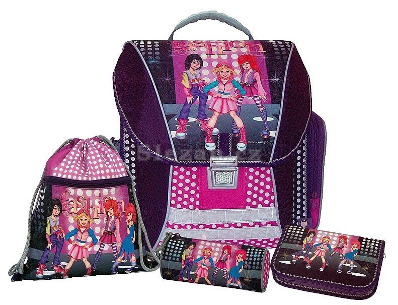 Set tvoří školní batoh pro první stupeň s kovovým zámečkem a anatomickými zády, penál s jednou klopou, etue a velký sáček s kapsou na zip.