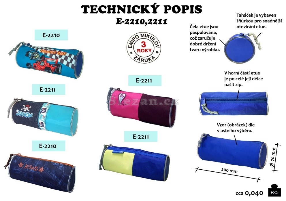 Válcová školní etue je praktický výrobek na volné ukládání školních psacích potřeb nebo jiných drobných osobních předmětů. Čela etue jsou paspulována, což zaručuje dobré držení válcovitého tvaru výrobku. Její rozměr je: průměr válce 70mm a délka 200mm. Váha cca 0,04kg.