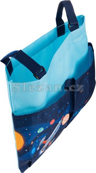 Pomocí suchého zipu se připevní ke školní lavici, k uložení slouží jedna velká a dvě menší kapsy.