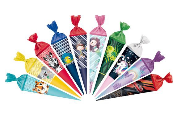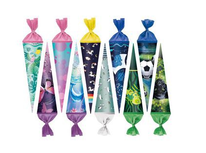 Školní kornout 35 cm, kulatý, uzavíratelný krepovým papírem, deset motivů