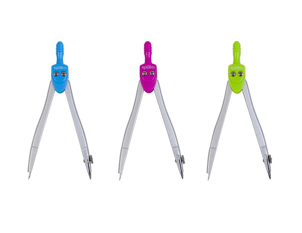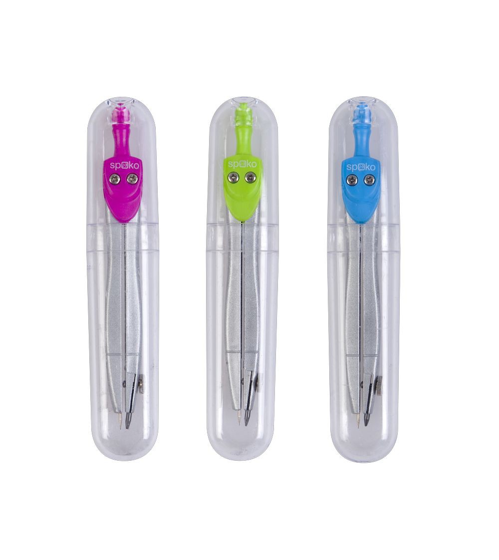 Jednoduché kovové kružítko s neonovými barevnými prvky. Kružnice Ø 17 cm. Baleno v transparentní plastové etui. Dodáváno v barevném mixu.
