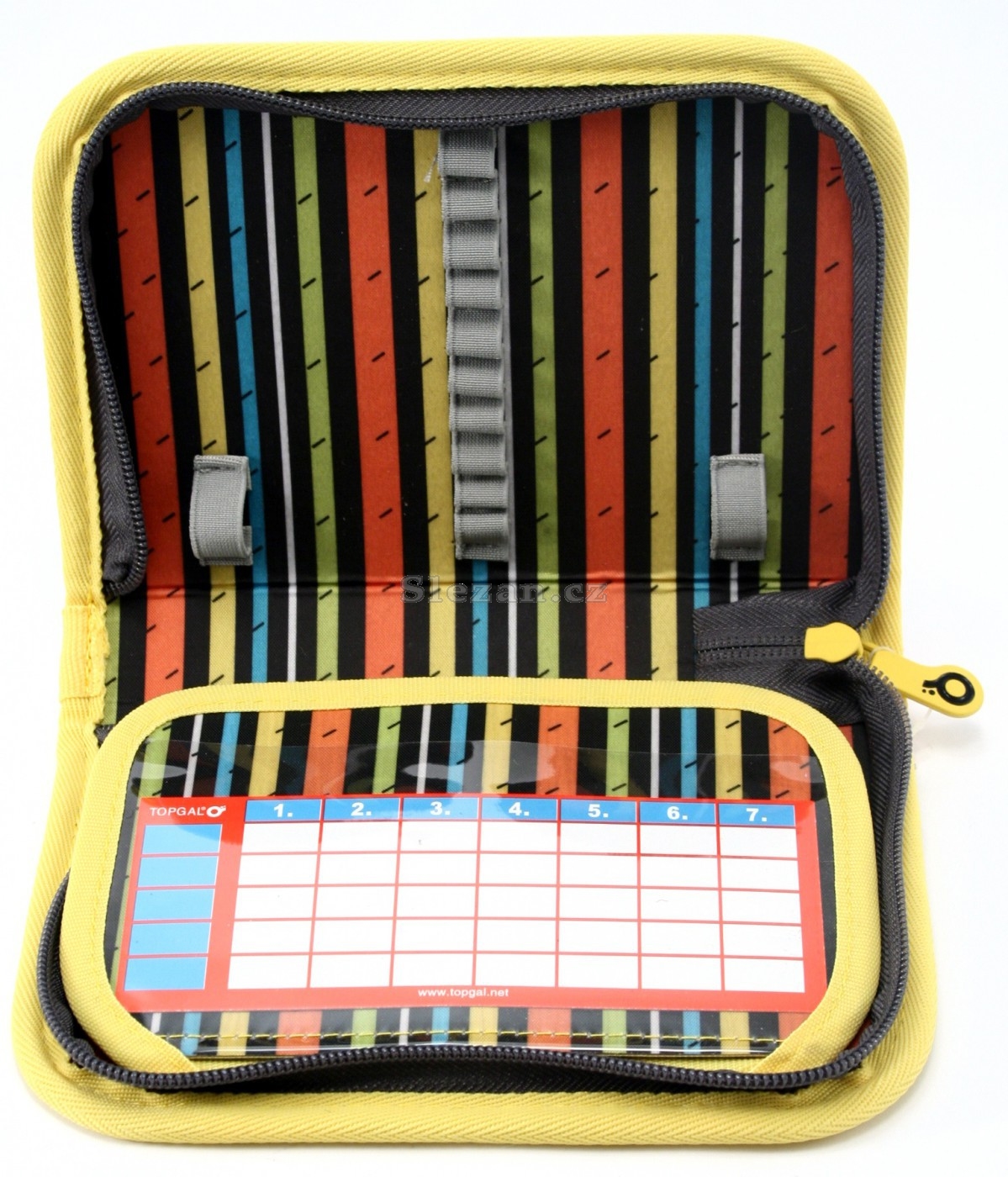 Uvnitř vybaven gumovými úchyty na psací potřeby a přepážkou s průhlednou folií a rozvrhem hodin.