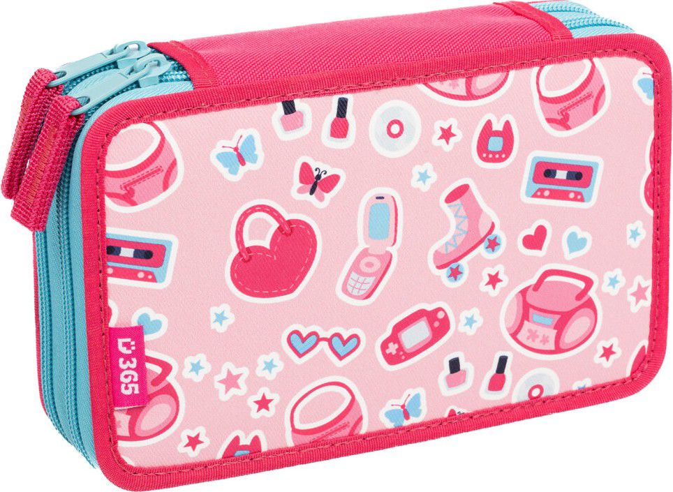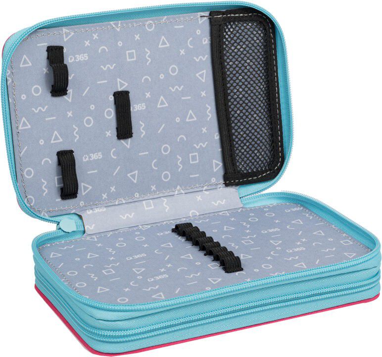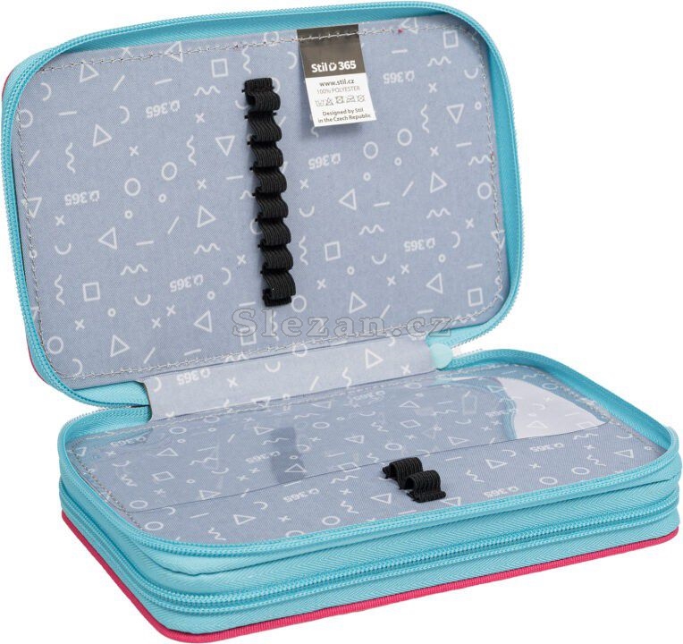 Dvoupatrové penály obsahují v prvním patře 8 gumiček na pastelky a tužky, dále gumičky na ořezávátko, gumu či nůžky a nyní nově síťovanou kapsičku s pružným lemem pro uložení drobností.