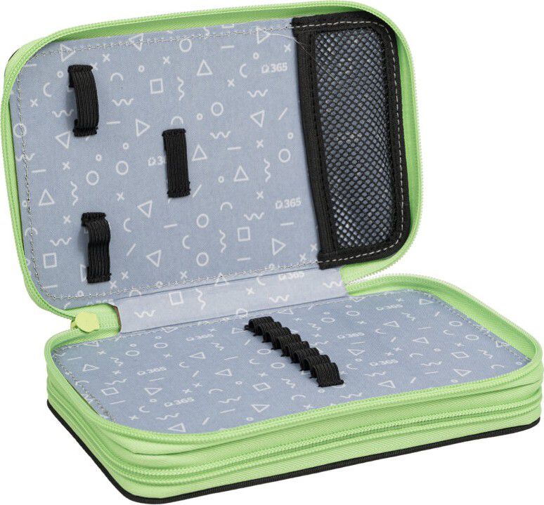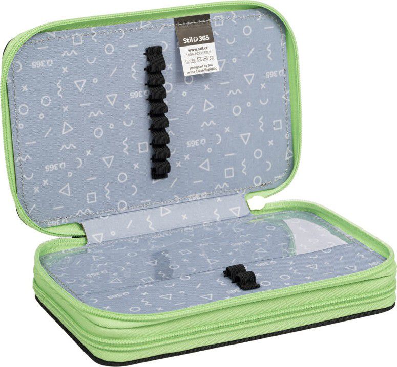 Dvoupatrové penály obsahují v prvním patře 8 gumiček na pastelky a tužky, dále gumičky na ořezávátko, gumu či nůžky a nyní nově síťovanou kapsičku s pružným lemem pro uložení drobností.