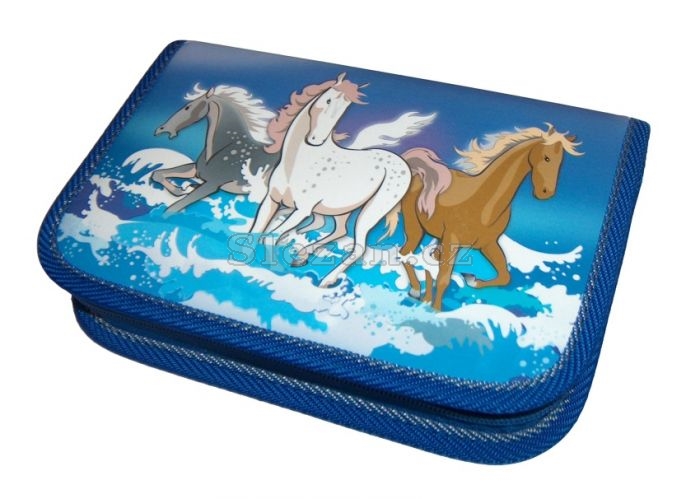 Plněný školní jednopatrový penál s klopou obsahuje: ořezávátko 1ks, stěrací pryž 1ks, propisovací tužku 1ks, tzv.„čínské pero“ 1ks, grafickou tužku 4 ks, školní pastelky 8 ks, popisovače 6 ks