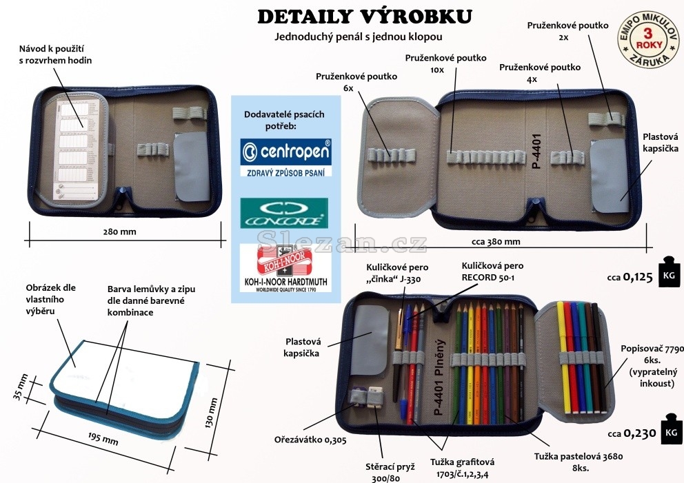 Uzavírá se na jeden samostatný zip. Má celkem 23 pružných gumových poutek pro uložení psacích potřeb.