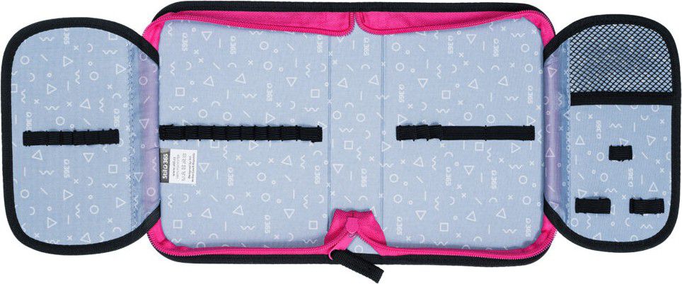 Přesně 24 pevných gumiček různých velikostí slouží k pohodlnému uložení pastelek, psacího pera, tužek, pravítka, ořezávátka a gumy.