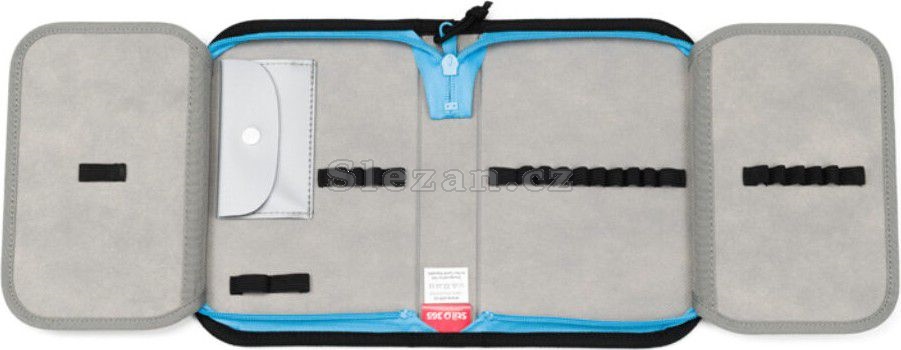 23 pevných gumiček různých velikostí k pohodlnému uložení větších pastelek nebo psacího pera, pravítka, ořezávátka a gumy.