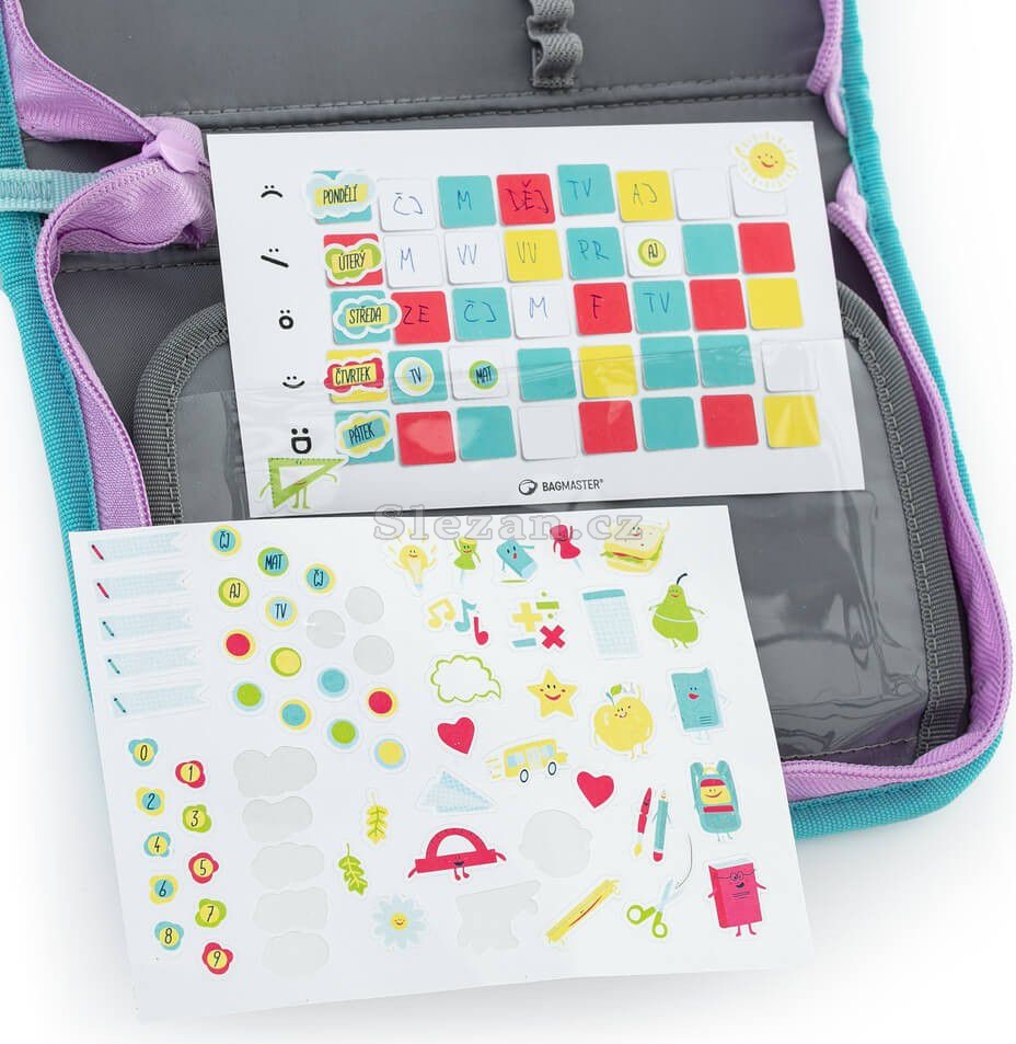 Kvalitní kovový zip a průhledná kapsa na rozvrh se samolepkami, který dostanete jako dárek