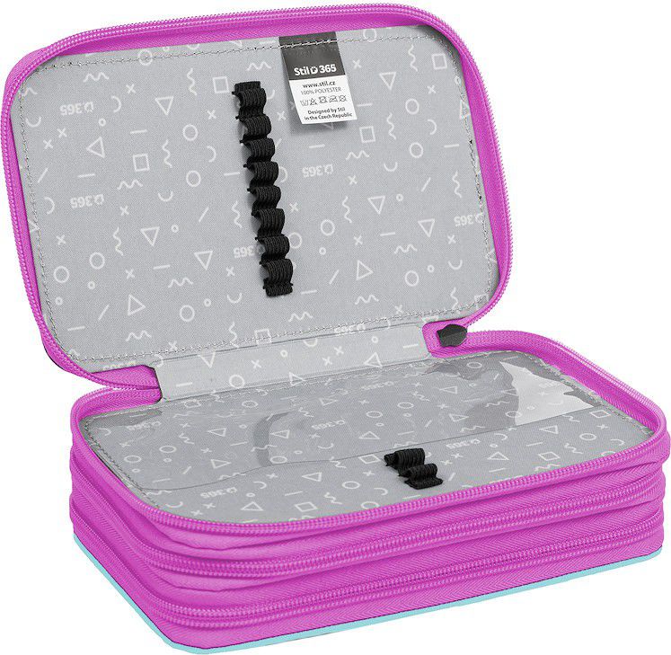 Ve druhém patře je umístěna průhledná kapsička na rozvrh a 10 pevných gumiček na psací potřeby různých velikostí.