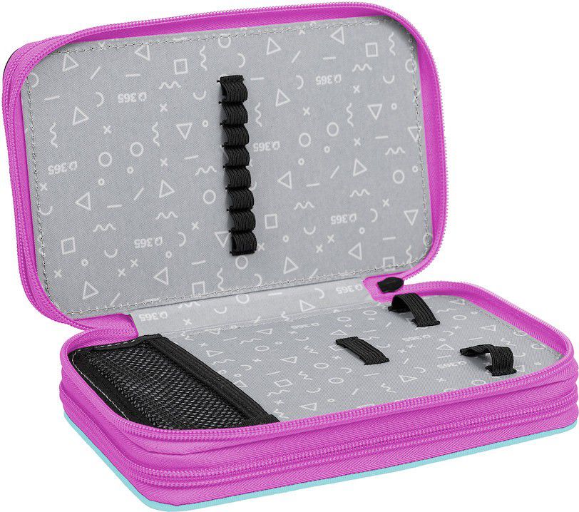 První patro obsahuje 8 gumiček na pastelky, 3 širší gumičky na ořezávátko i gumu a nově také síťovanou kapsičku s pružným lemem na uložení drobností.