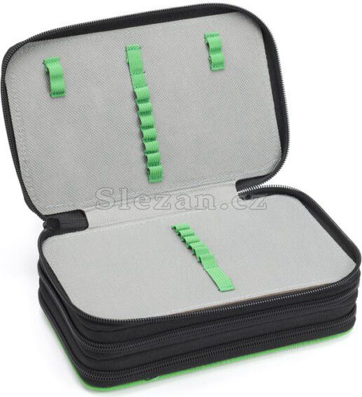 Ve druhém patře je umístěna průhledná kapsička na rozvrh a 9 pevných gumiček na psací potřeby různých velikostí.