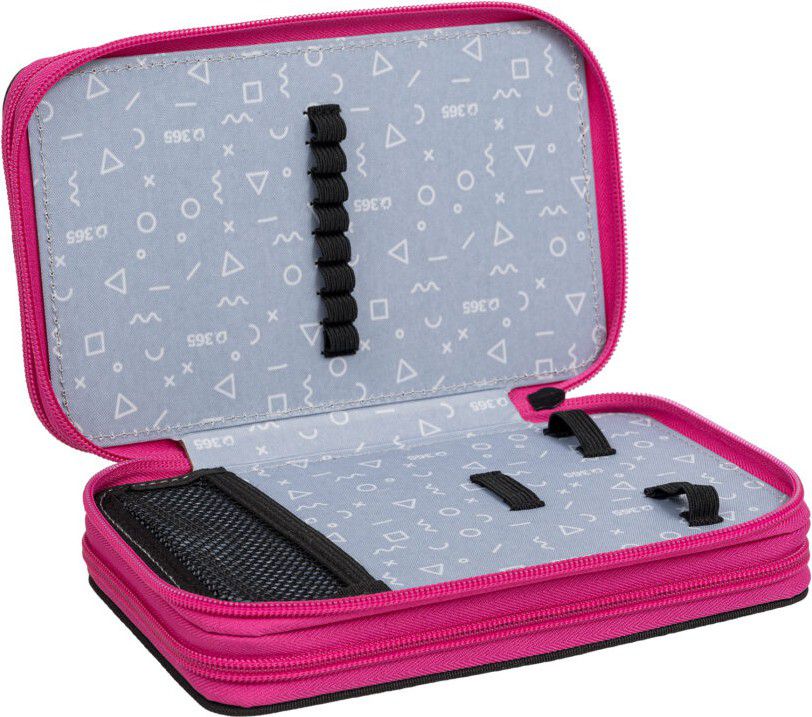 První patro obsahuje 8 gumiček na pastelky, 3 širší gumičky na ořezávátko i gumu a nově také síťovanou kapsičku s pružným lemem na uložení drobností.