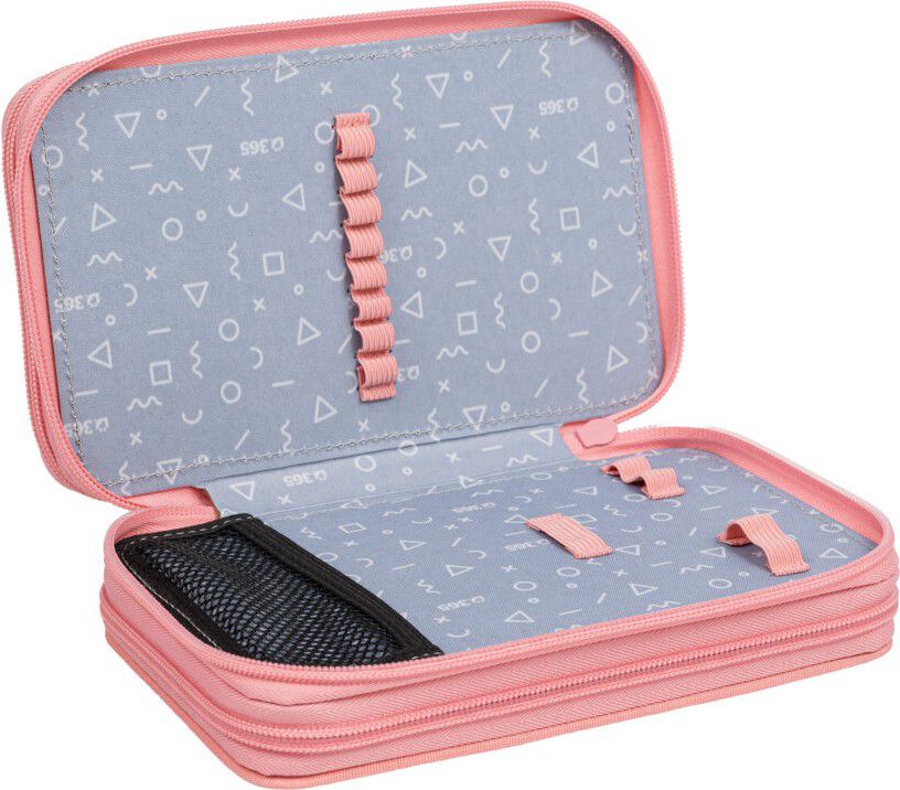 První patro obsahuje 8 gumiček na pastelky, 3 širší gumičky na ořezávátko i gumu a nově také síťovanou kapsičku s pružným lemem na uložení drobností.