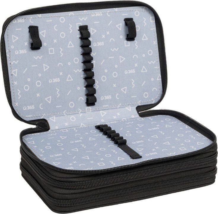 První patro obsahuje 8 gumiček na pastelky, 3 širší gumičky na ořezávátko i gumu a nově také síťovanou kapsičku s pružným lemem na uložení drobností.