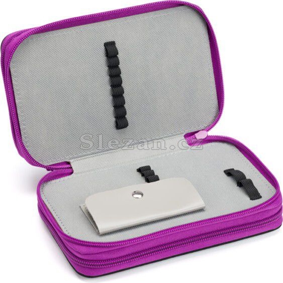 Ve druhém patře je umístěna průhledná kapsička na rozvrh a 9 pevných gumiček na psací potřeby různých velikostí.