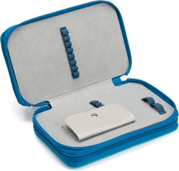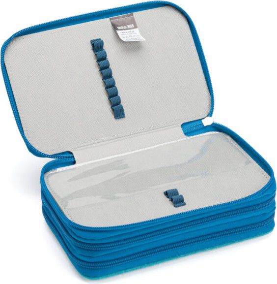 Ve druhém patře je umístěna průhledná kapsička na rozvrh a 9 pevných gumiček na psací potřeby různých velikostí.