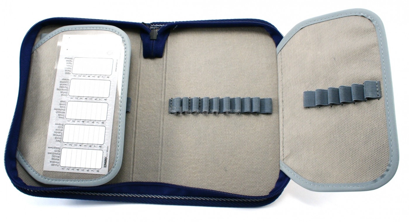 Má celkem 23 pružných gumových poutek pro uložení psacích potřeb.