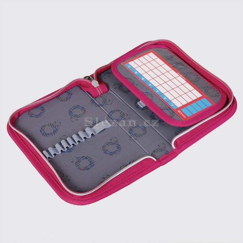 Jednopatrové školní pouzdro, vybavené gumovými úchyty a přepážkou s průhlednou fólií a rozvrhem hodin.