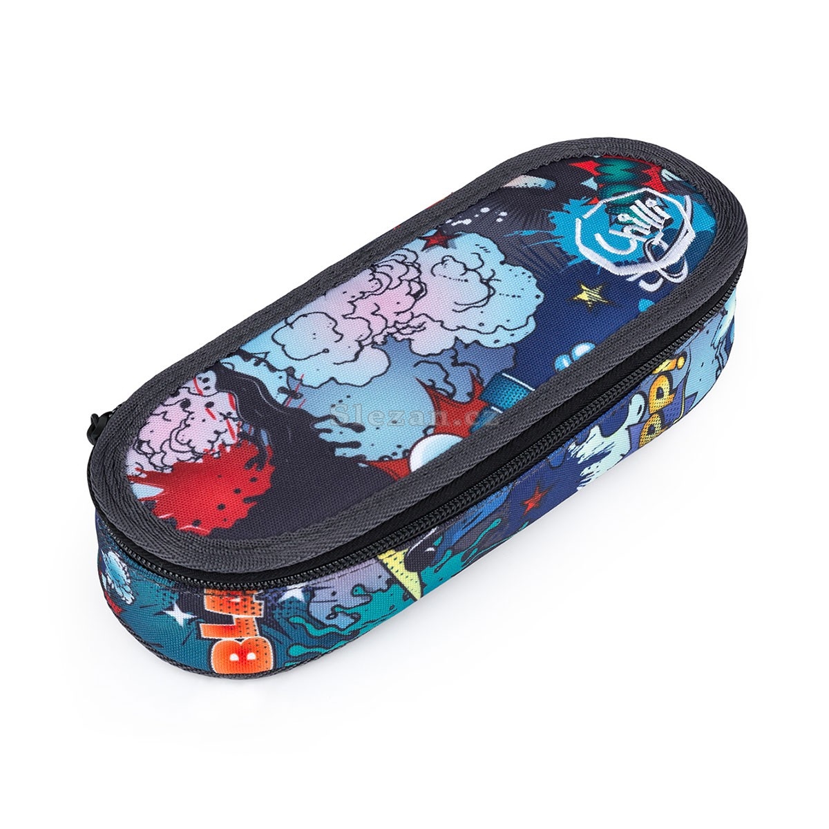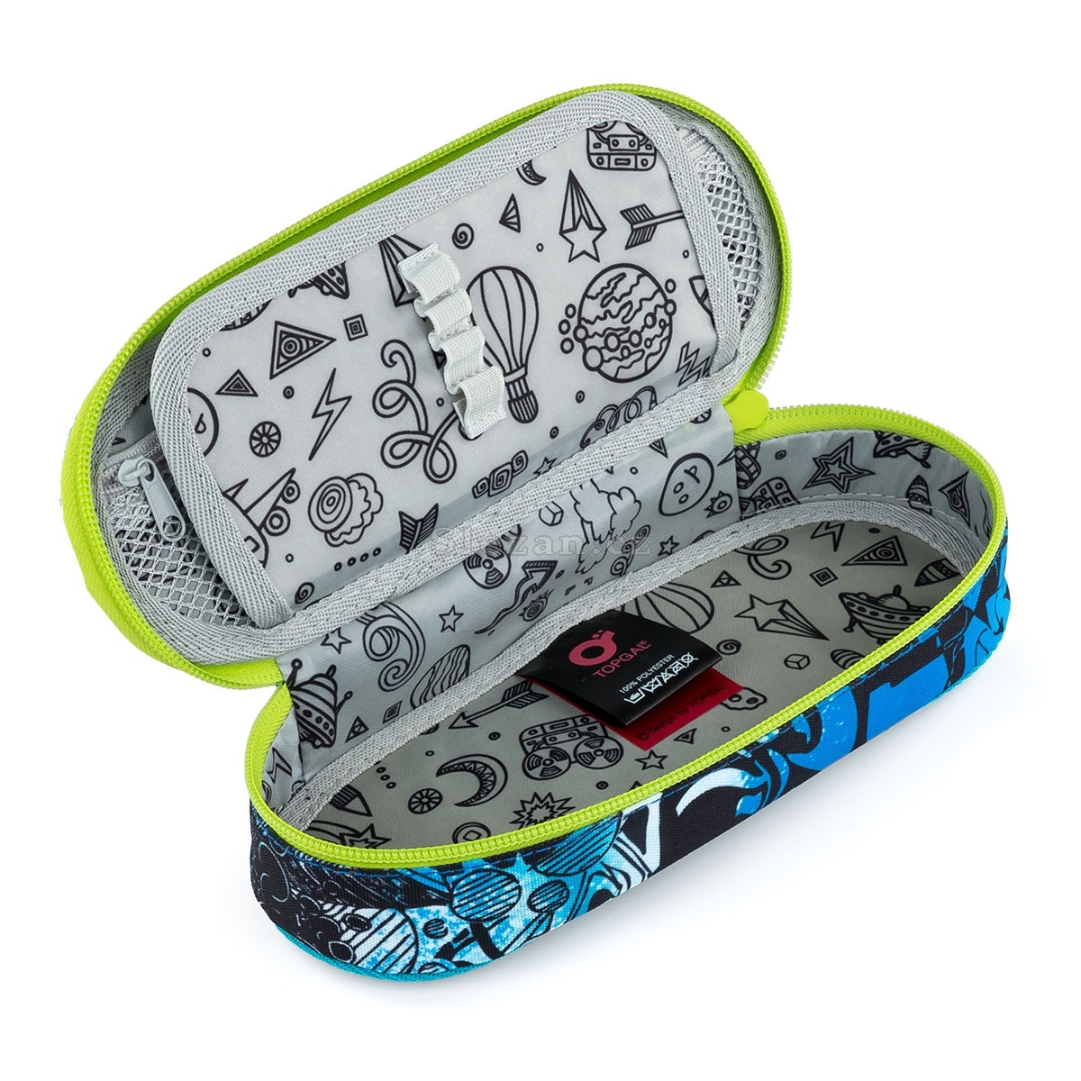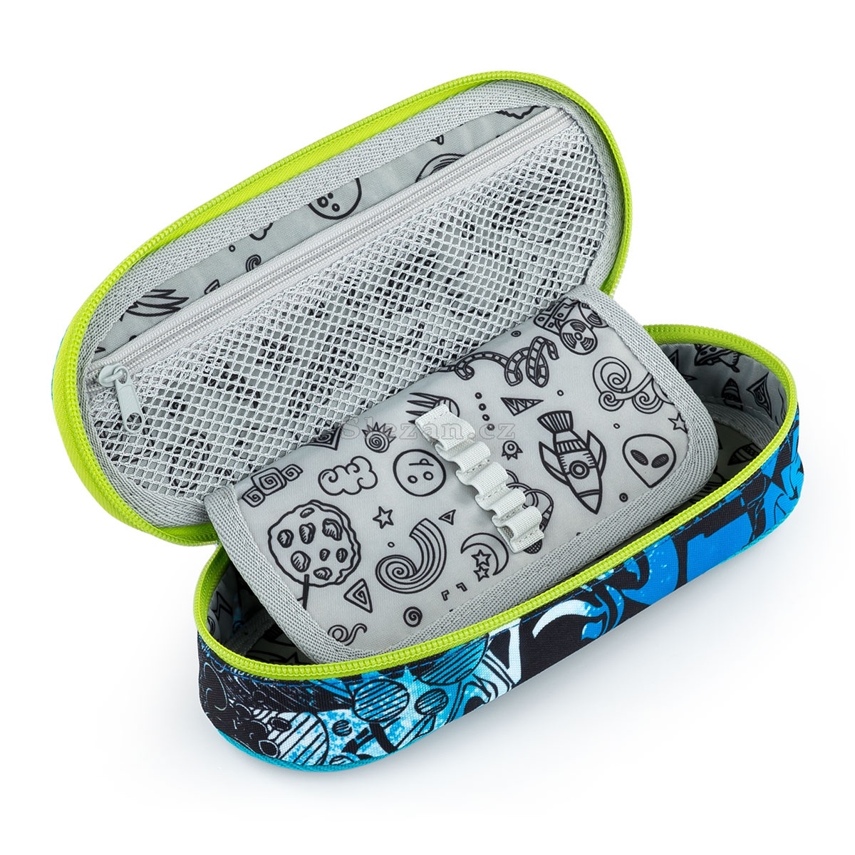 Oválný penál pro všechny potřebnosti ocení spíše starší školáci. Uvnitř pouzdra je síťová kapsička na zip a klopa, na níž jsou umístěny gumičky pro uchycení celkem devíti tužek a propisek, které je potřeba mít přehledně uspořádané a po ruce. Volný prostor pod klopou pak umožňuje volně umístit další psací potřeby – pastelky, fixy, prostě cokoliv potřebujete.