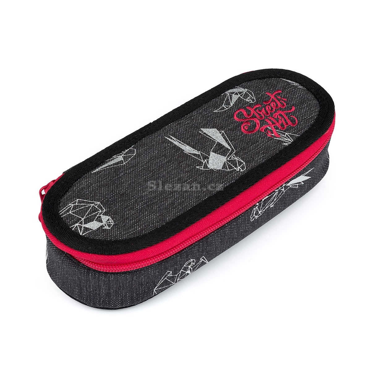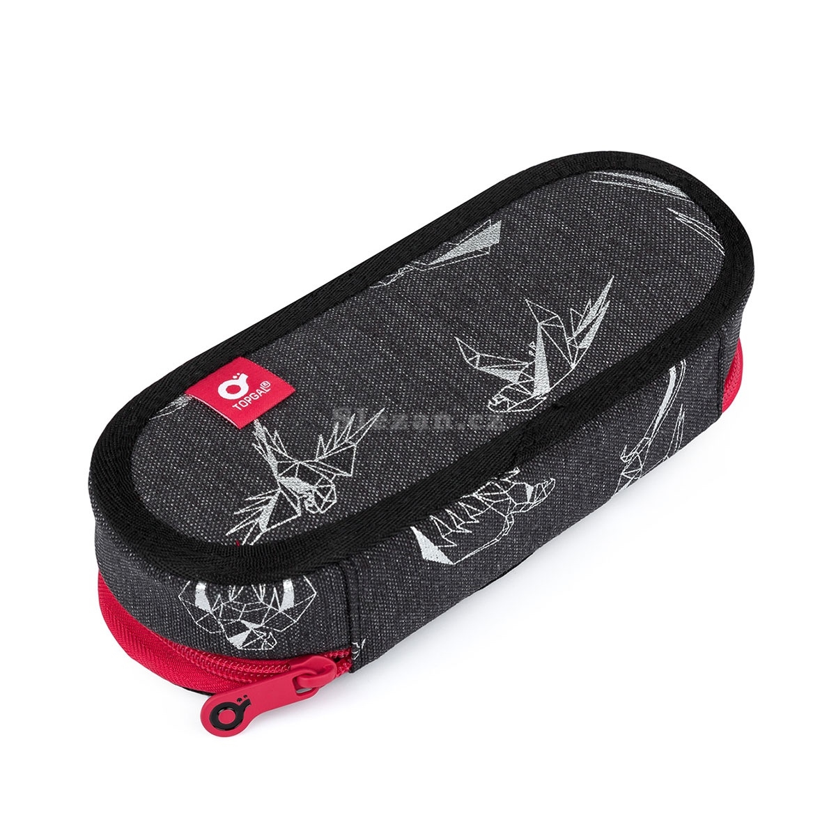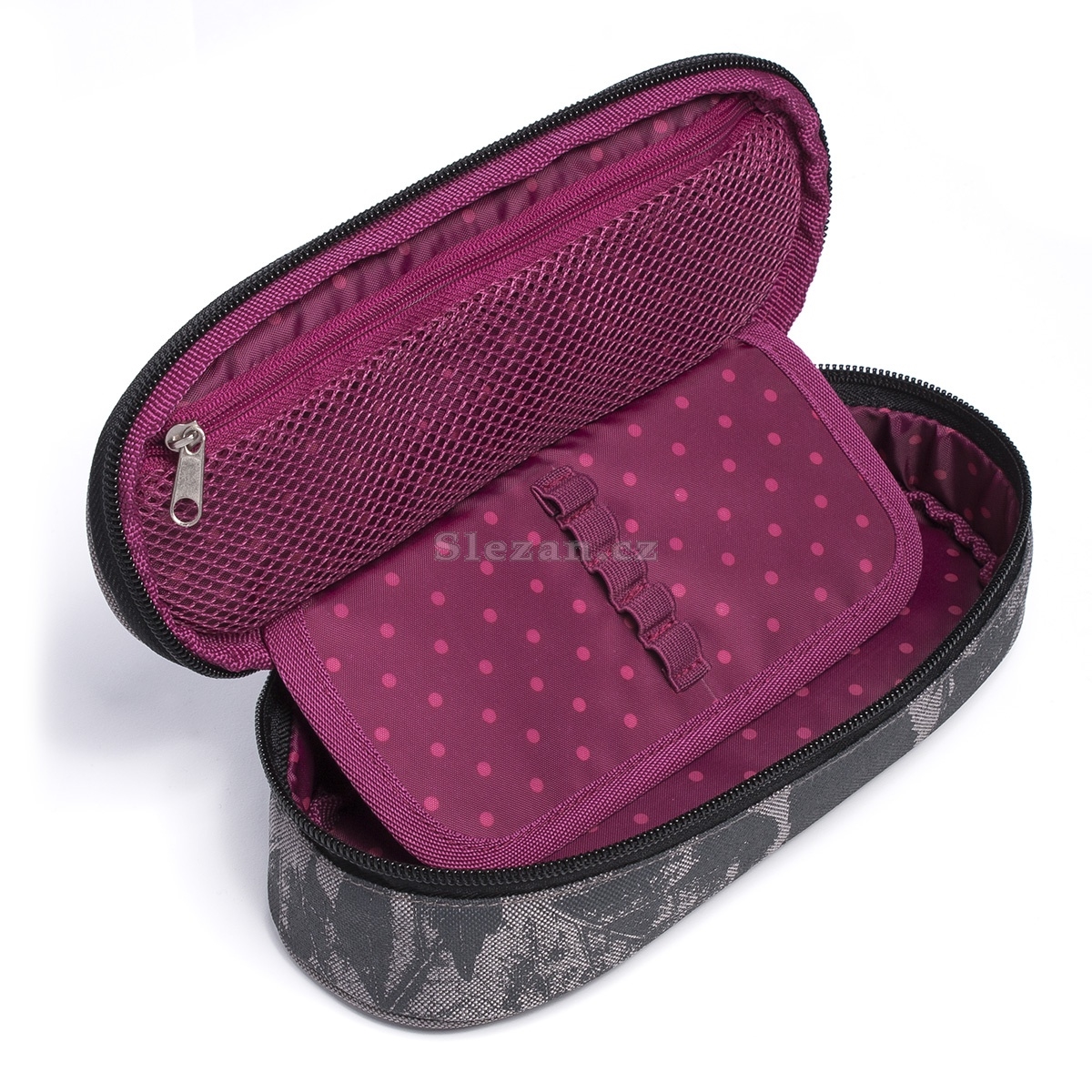 Oválný penál pro všechny potřebnosti. Uvnitř pouzdra je síťová kapsička na zip a klopa, na níž jsou umístěny gumičky pro uchycení celkem devíti tužek a propisek, které je potřeba mít přehledně uspořádané a po ruce. Volný prostor pod klopou pak umožňuje volně umístit další psací potřeby – pastelky, fixy, prostě cokoliv potřebujete.