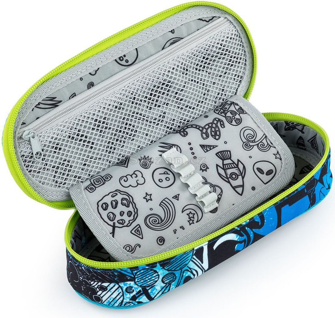 Oválný penál pro všechny potřebnosti ocení spíše starší školáci. Uvnitř pouzdra je síťová kapsička na zip a klopa, na níž jsou umístěny gumičky pro uchycení celkem devíti tužek a propisek, které je potřeba mít přehledně uspořádané a po ruce. Volný prostor pod klopou pak umožňuje volně umístit další psací potřeby – pastelky, fixy, prostě cokoliv potřebujete. Pouzdro je polstrované, takže se vaše tužky zaručeně nepolámou. Zipy s velkými taháčky umožní bezproblémovou manipulaci s pouzdrem. Pouzdro prosím v pračce neperte, je vyztuženo papírem, praní by nepřežilo... Pozor! Novinka! Vnitřní školních podšívka školních etuí je vyrobena z šedé látky a obrazce na ní vytištěné je možné vybarvovat! Doporučujeme k vybarvení použít klasické pastelky, fixy by se mohly rozpíjet…