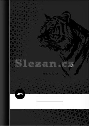Školní sešit ve formátu A4, čtverečkovaný, v černé barvě, s motivem tygra, v deskách z křídového papíru.