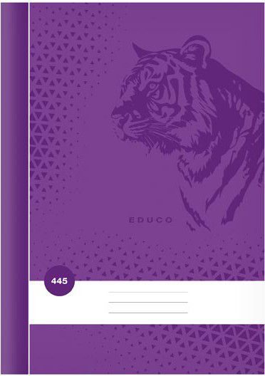 Školní sešit ve formátu A4, čtverečkovaný, v tmavě fialové barvě, s motivem tygra, v deskách z křídového papíru.