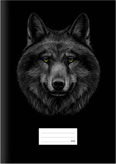 Školní sešit bez linek ve formátu A4, v černé barvě, s motivem vlka, v originálních deskách s matným laminem a lokálním UV lakem.