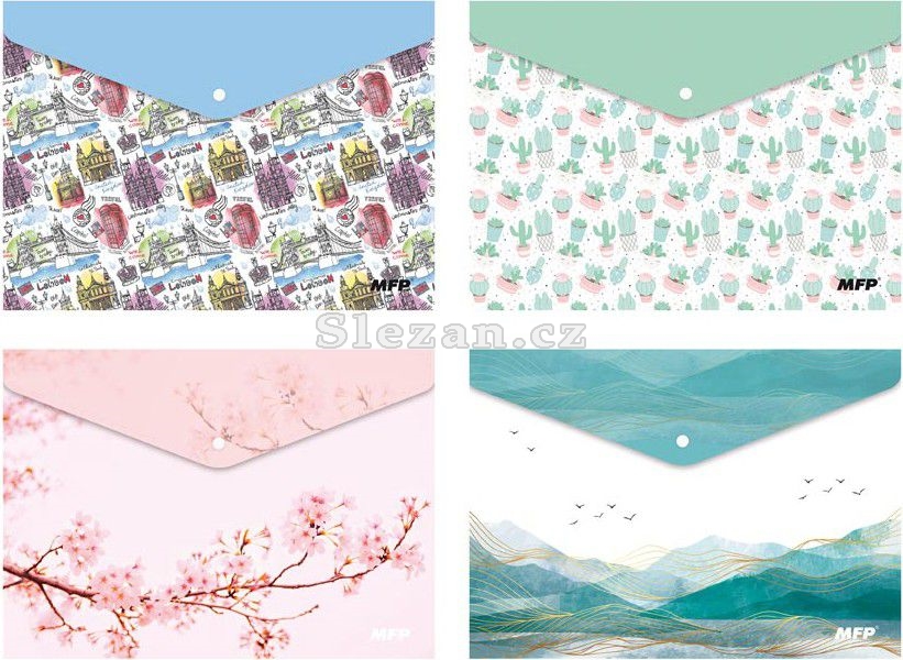 Složka z PolyPropylenu (PP), která se zavírá pomocí druku, ve formátu A4. Složka slouží jako pomocník pro třídění a ukládání dokumentů, takže je budete mít vždy pohromadě. MATERIÁL: PP SÍLA MATERIÁLU: 0,21 mm POTISK: Londýn, kaktusy, květy, vlny Dodáváme v mixu po 4 ks dle skladové zásoby. Uvedená cena je za 1 ks.