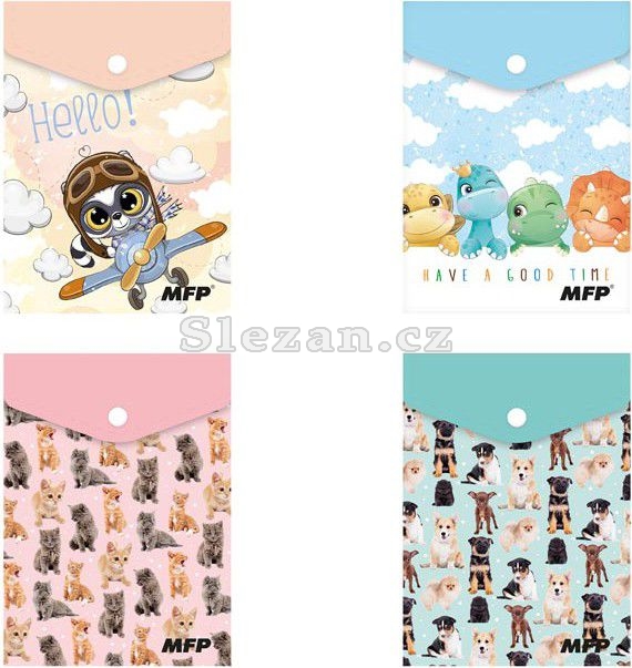 Složka z PolyPropylenu (PP), která se zavírá pomocí druku ve formátu A6, s dětským potiskem, v pastelových barvách.
