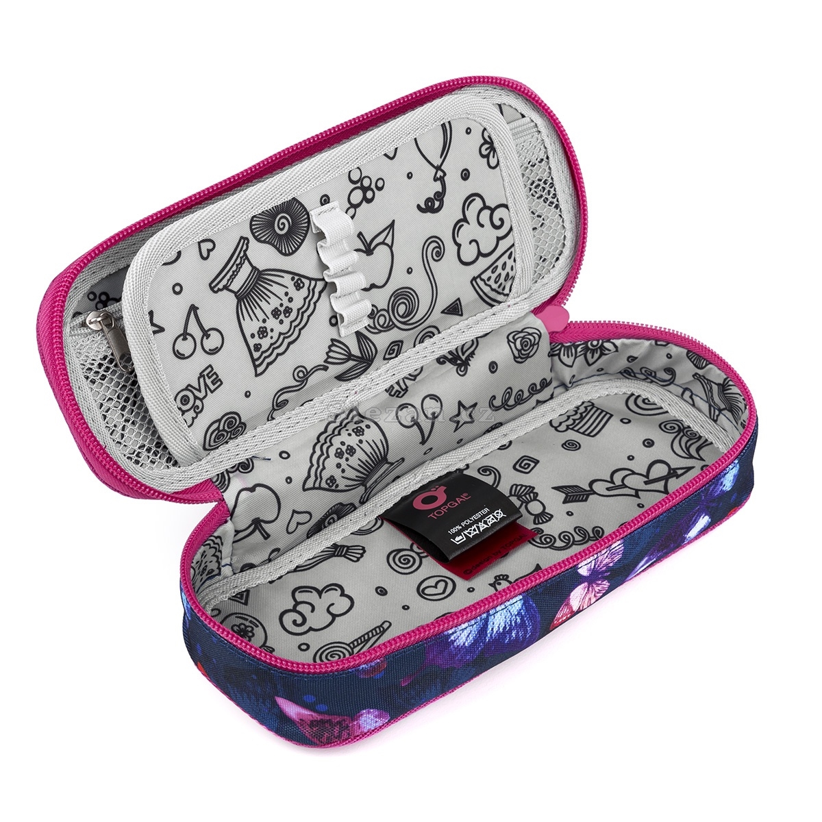 Uvnitř pouzdra je síťová kapsička na zip a klopa, na které jsou umístěny gumičky pro uchycení celkem devíti tužek a propisek. Volný prostor pod klopou pak umožňuje volně umístit další psací potřeby – pastelky, fixy, prostě cokoliv potřebujete.