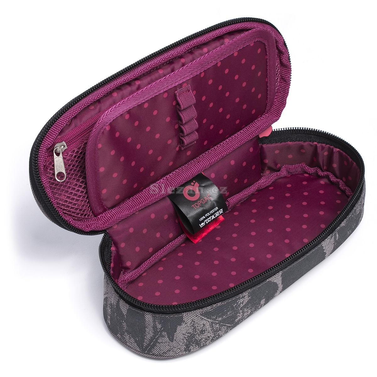 Oválný penál pro všechny potřebnosti. Uvnitř pouzdra je síťová kapsička na zip a klopa, na níž jsou umístěny gumičky pro uchycení celkem devíti tužek a propisek, které je potřeba mít přehledně uspořádané a po ruce. Volný prostor pod klopou pak umožňuje volně umístit další psací potřeby – pastelky, fixy, prostě cokoliv potřebujete.