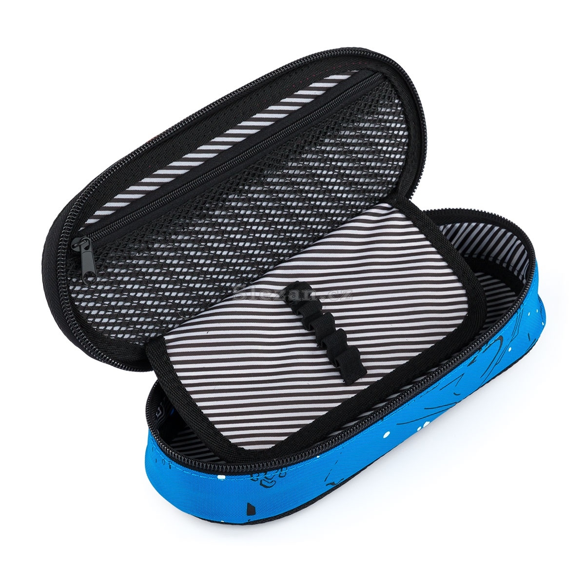 Oválný penál pro všechny potřebnosti. Uvnitř pouzdra je síťová kapsička na zip a klopa, na níž jsou umístěny gumičky pro uchycení celkem devíti tužek a propisek, které je potřeba mít přehledně uspořádané a po ruce. Volný prostor pod klopou pak umožňuje volně umístit další psací potřeby – pastelky, fixy, prostě cokoliv potřebujete.