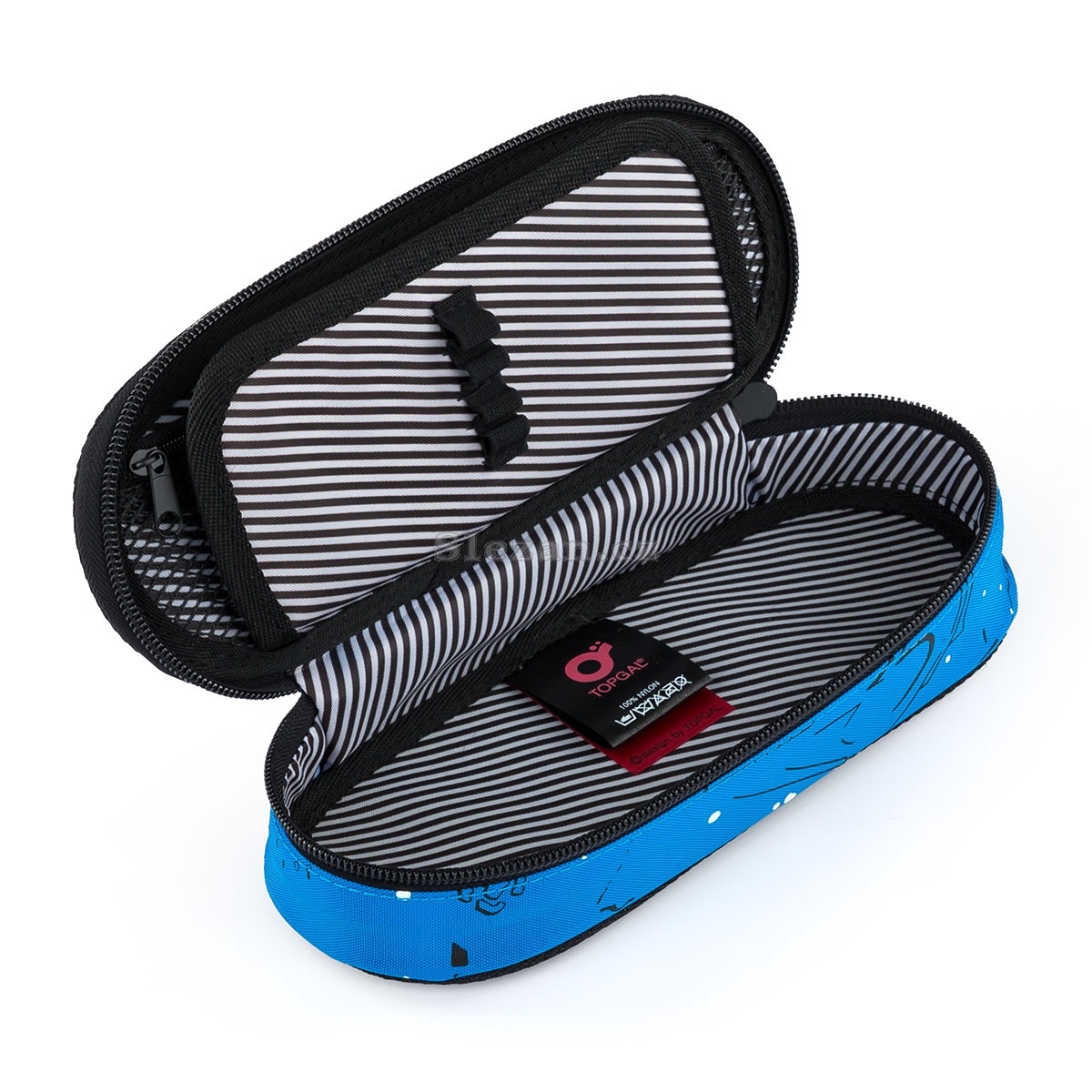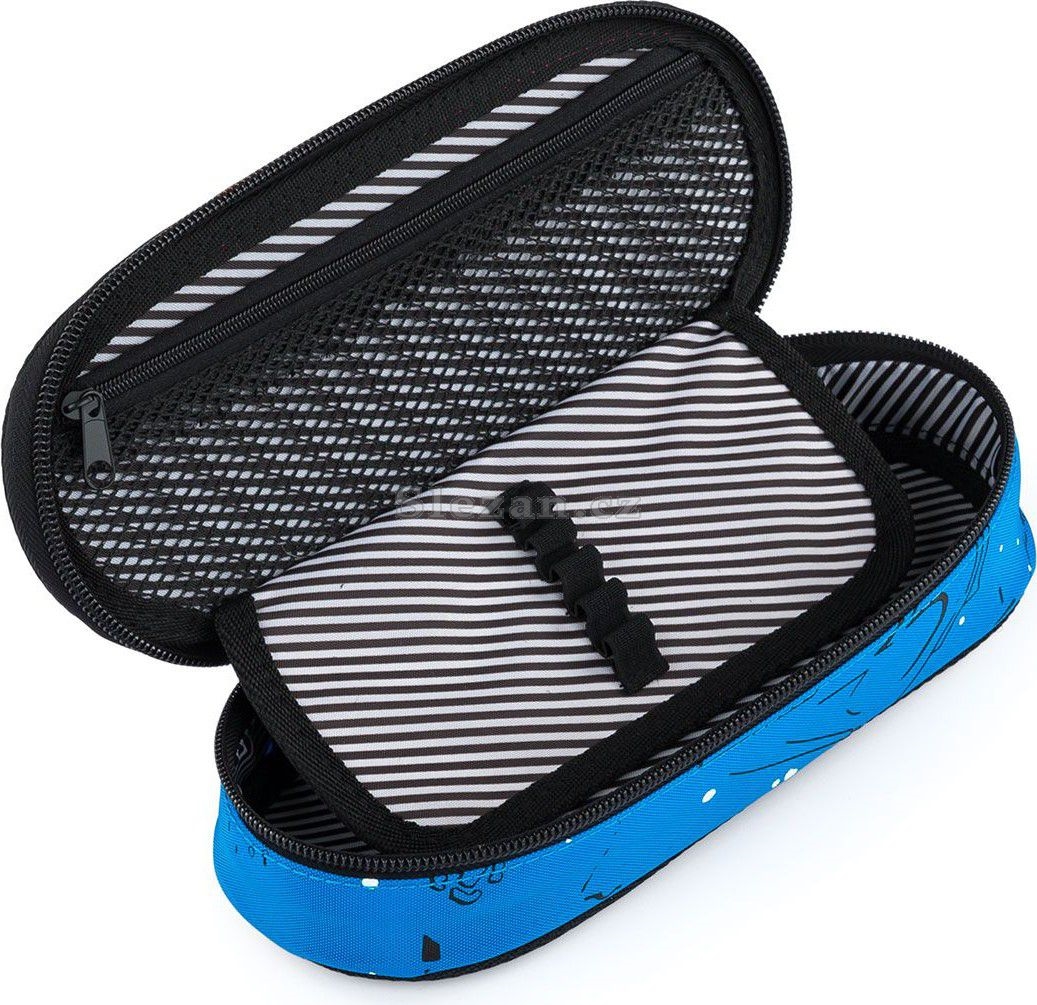 Oválný penál pro všechny potřebnosti. Uvnitř pouzdra je síťová kapsička na zip a klopa, na níž jsou umístěny gumičky pro uchycení celkem devíti tužek a propisek, které je potřeba mít přehledně uspořádané a po ruce. Volný prostor pod klopou pak umožňuje volně umístit další psací potřeby – pastelky, fixy, prostě cokoliv potřebujete.