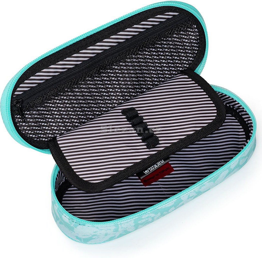 Uvnitř pouzdra je síťová kapsička na zip a klopa, na níž jsou umístěny gumičky pro uchycení celkem devíti tužek a propisek, které je potřeba mít přehledně uspořádané a po ruce.